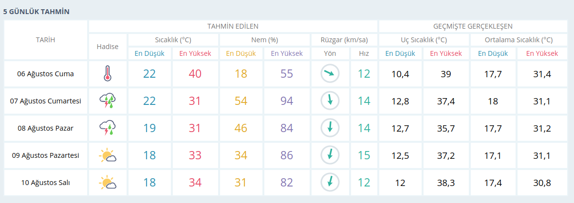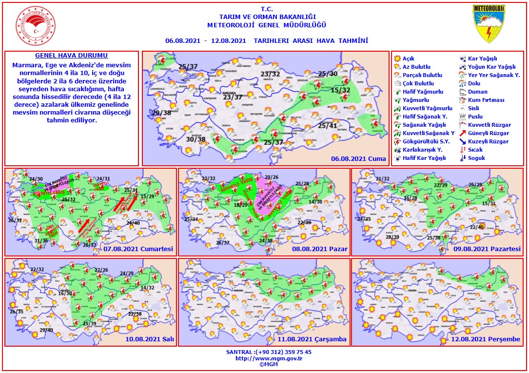 Haftalık Hava Durumu (6 – 12 Ağustos 2021) Marmara, Ege ve Akdeniz’de mevsim normallerinin 4 ila 10, iç ve doğu bölgelerde 2 ila 6 derece üzerinde seyreden hava sıcaklıkları hafta sonunda hissedilir derecede (4 ila 12 derece) azalarak mevsim normalleri civarına düşecek.