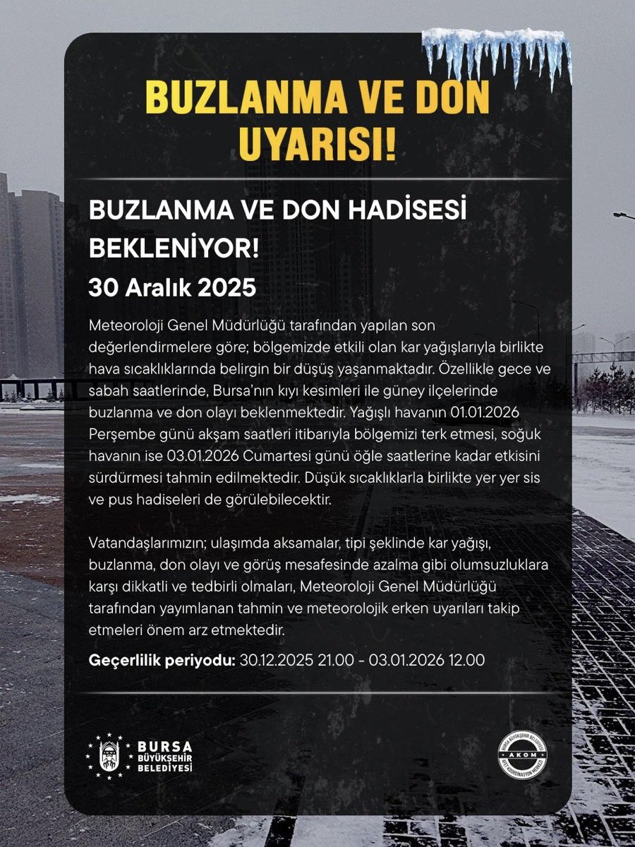 Bursa Büyükşehir Belediyesi, ‘Buzlanma, gizli buzlanma ve don olayı ile görüş mesafesinde azalma gibi olumsuzluklara karşı tedbirli ve dikkatli olalım’ uyarısında bulundu…
