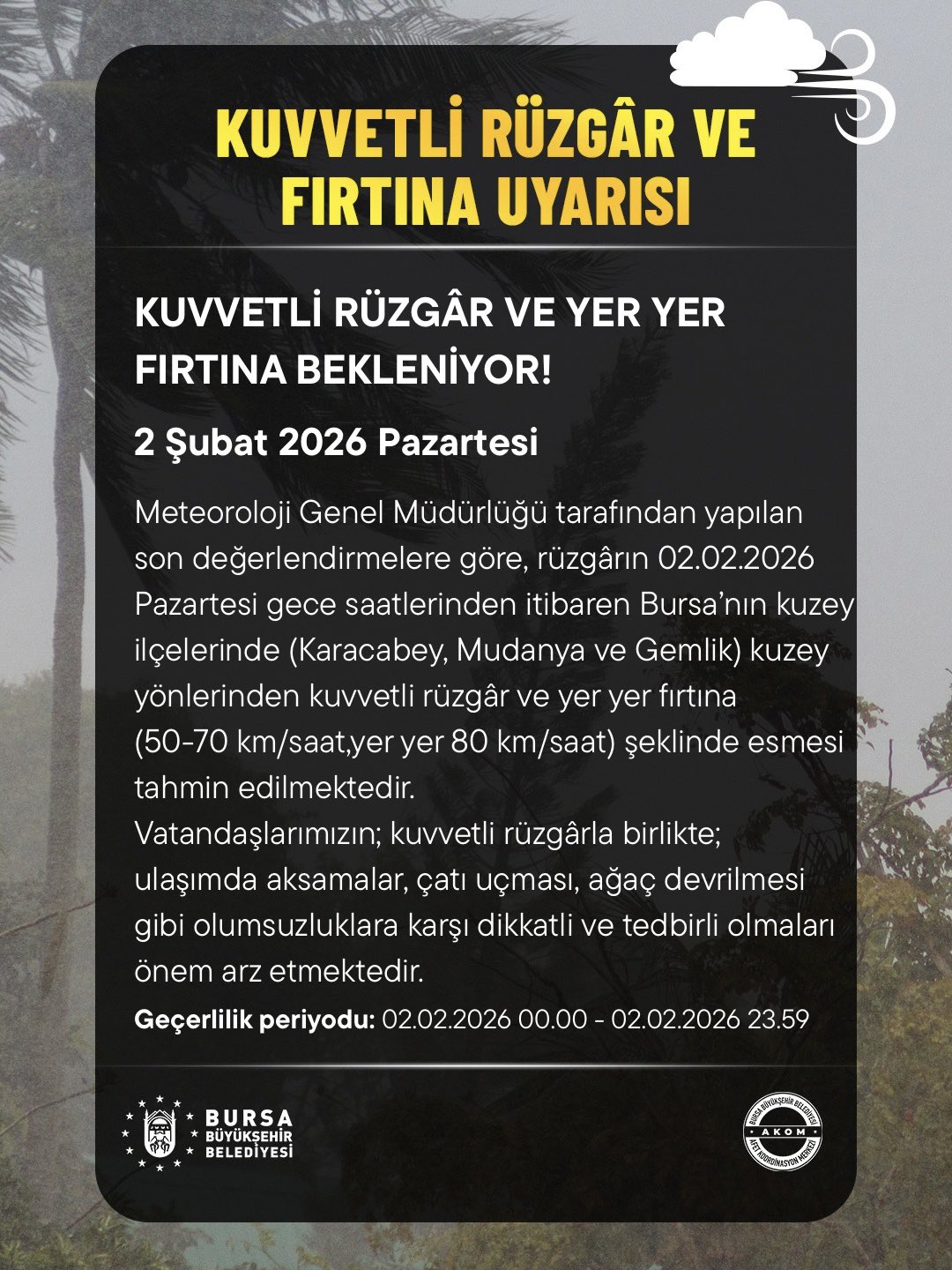 Ana Sayfa › Bursa › Bursalılara bir uyarı da Büyükşehir’denBursalılara bir uyarı da Büyükşehir’den Bursa Büyükşehir Belediyesi, Bursa için kuvvetli rüzgar ve fırtına uyarısında bulundu… Giriş: 01-02-2026 22:13Kaynak: HABER MERKEZİ Bursa ABONE OL + - Bursa Büyükşehir’in uyarısı şöyle; HABERİ PAYLAŞ