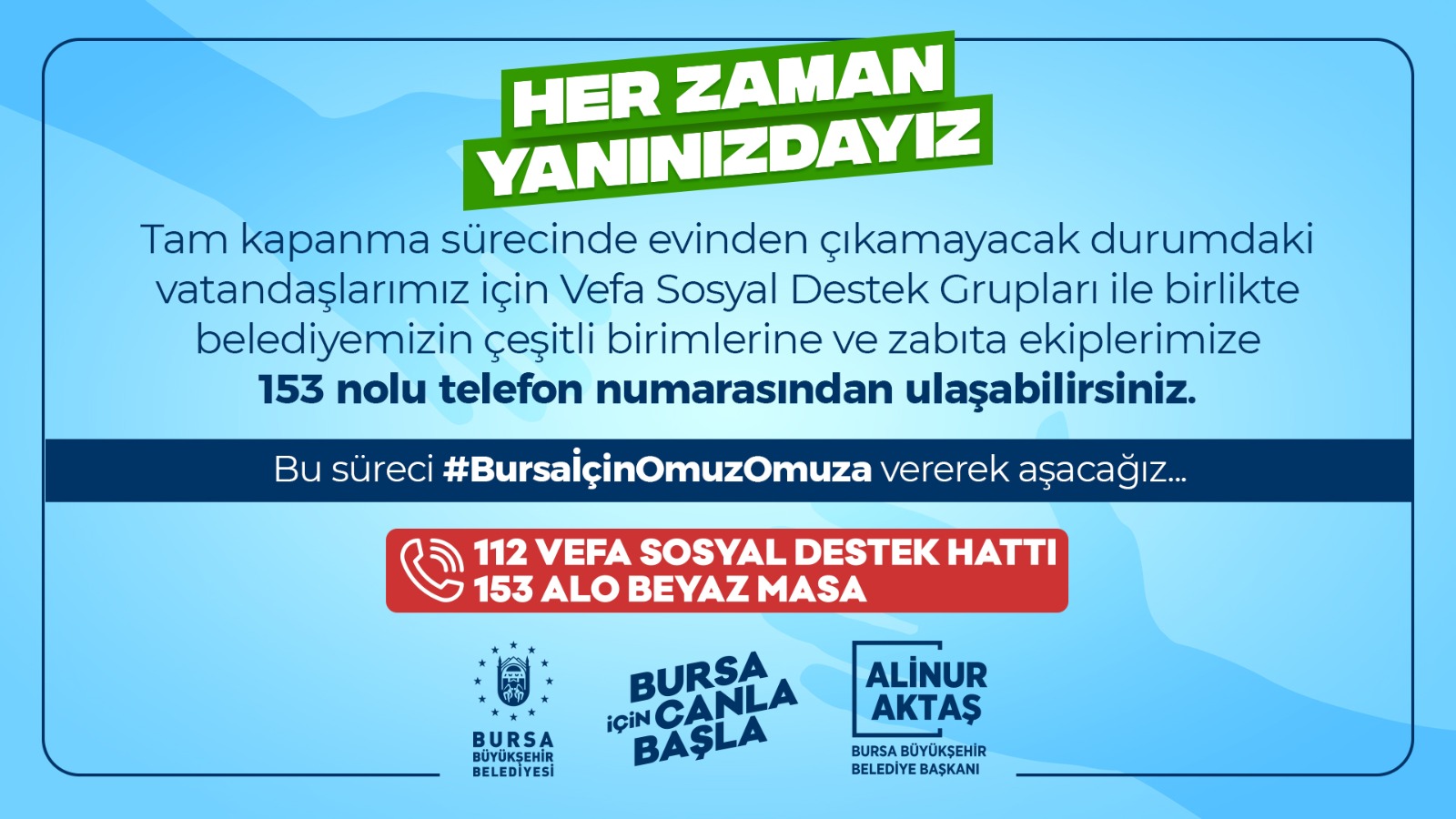 Tam kapanma sürecinde evinden çıkamayacak durumdaki vatandaşlarımız için vefa Sosyal Destek Grupları ile birlikte belediyemizin çeşitli birimlerine ve zabıta ekiplerimize 153 nolu telefon numarasından ulaşabilirsiniz…