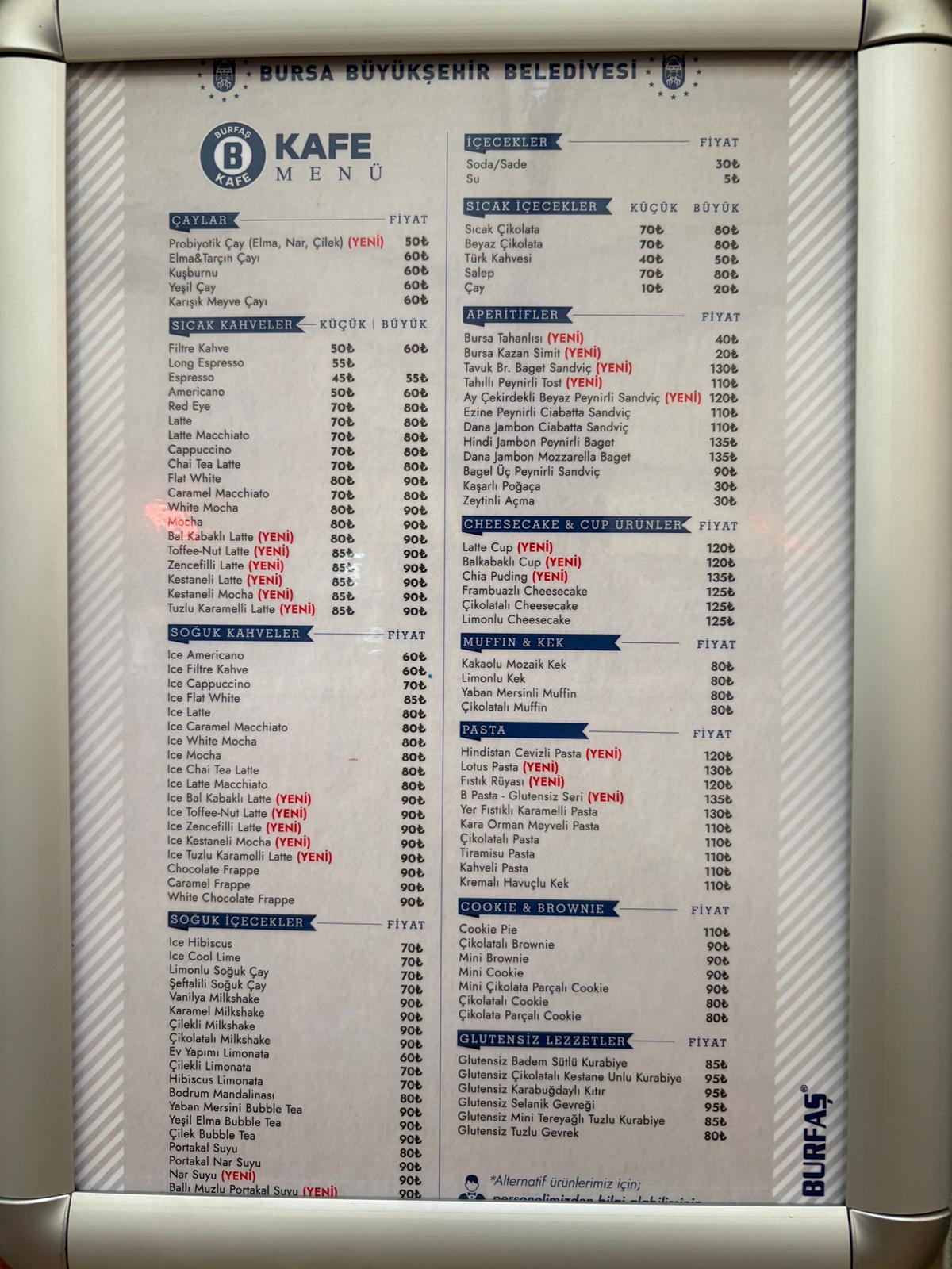 Burfaş Kafe menüsünde yapılan güncellemeyle birlikte çok sayıda yeni ürün satışa sunuldu. Bursa Büyükşehir Belediyesi iştiraki Burfaş tarafından hazırlanan güncel menüde, özellikle yeni nesil kahveler, tatlılar ve atıştırmalıklar öne çıkıyor.