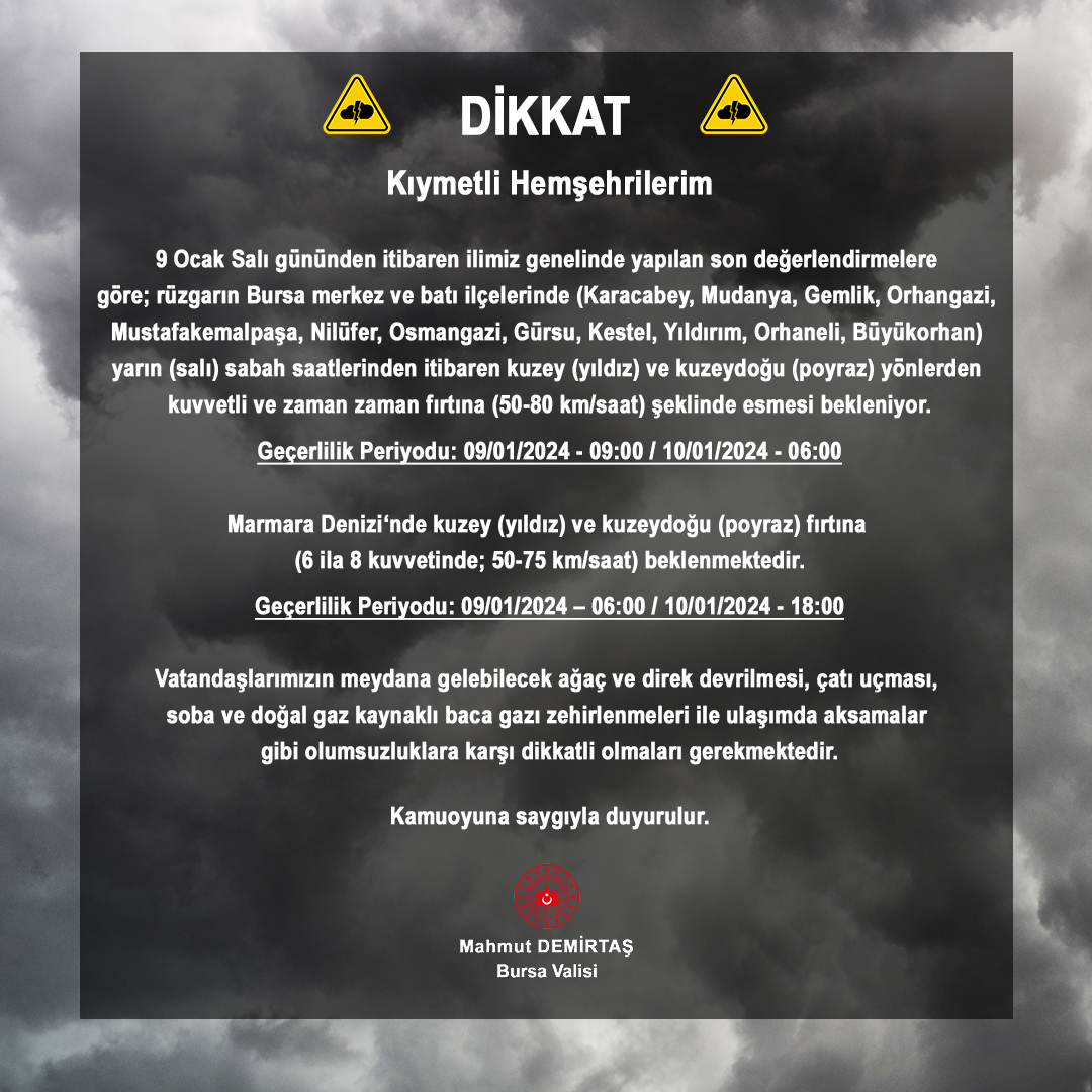 Ana Sayfa › Bursa › Bursa’nın 12 ilçesine kritik uyarı!Bursa’nın 12 ilçesine kritik uyarı! Bursa Valisi Mahmut Demirtaş, Bursa’nın 12 ilçesinde etkili olması beklenen fırtına için uyarıda bulundu… Giriş: 08-01-2024 16:00Güncelleme: 08-01-2024 16:37Kaynak: HABER MERKEZİ Bursa ABONE OL + - Bursa Valisi Mahmut Demirtaş’ın uyarısı şöyle; HABERİ PAYLAŞ
