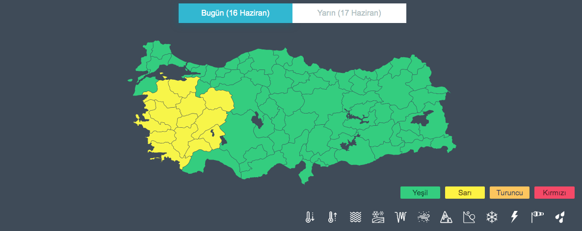 Afyonkarahisar, Aydın, Balıkesir, Burdur, Bursa, Denizli, Eskişehir, Isparta, İzmir, Kütahya, Manisa, Muğla ve Uşak için sarı kod verildi.