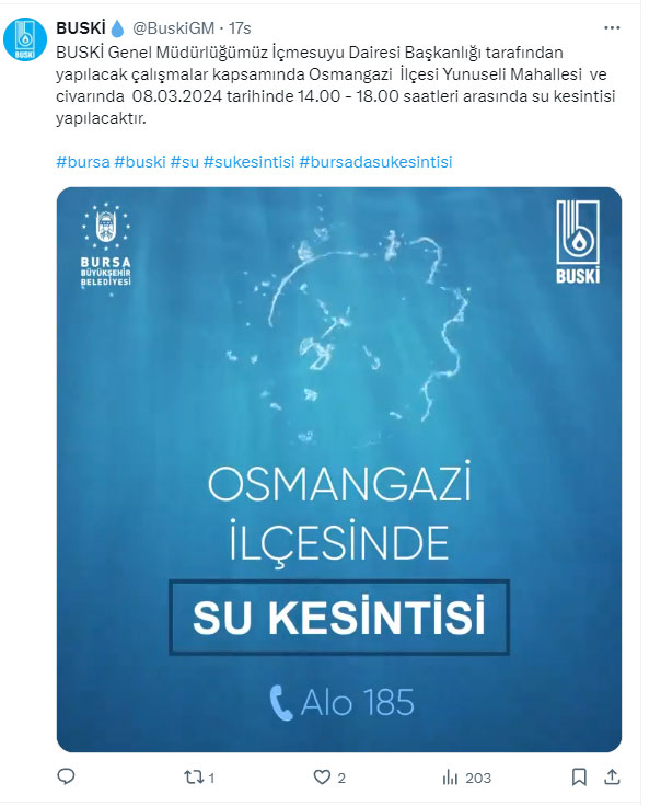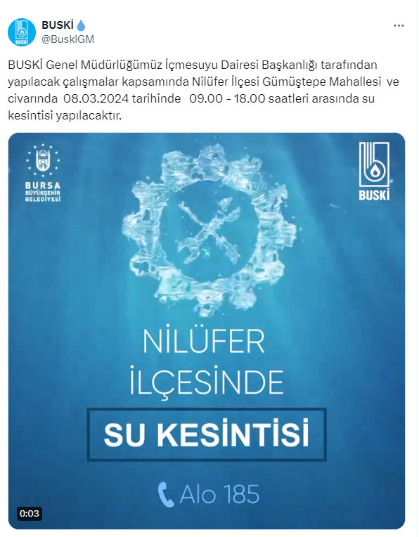 BUSKİ Genel Müdürlüğümüz İçmesuyu Dairesi Başkanlığı tarafından yapılacak çalışmalar kapsamında Osmangazi İlçesi Yunuseli Mahallesi ve civarında 08.03.2024 tarihinde 14.00 – 18.00 saatleri arasında ve Nilüfer İlçesi Gümüştepe Mahallesi ve civarında 08.03.2024 tarihinde 09.00 – 18.00 saatleri arasında su kesintisi yapılacaktır.