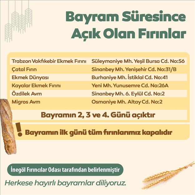 “Buna göre; bayramın 2, 3 ve 4’üncü günü; Süleymaniye Mahallesi Yeşil Bursa Caddesi No:56 adresindeki Trabzon Vakfıkebir Ekmek Fırını, Sinanbey Mahallesi Yenişehir Caddesi No:31/B adresindeki Çatal Fırın, Burhaniye Mahallesi İstiklal Caddesi No: 41 adresindeki Ekmek Dünyası, Yeni Mahalle Yunusemre Caddesi No:26/A adresindeki Kayalar Ekmek Fırını, Özdilek AVM ve İnegöl AVM içerisinde bulunan Migros AVM hizmet verecek.”