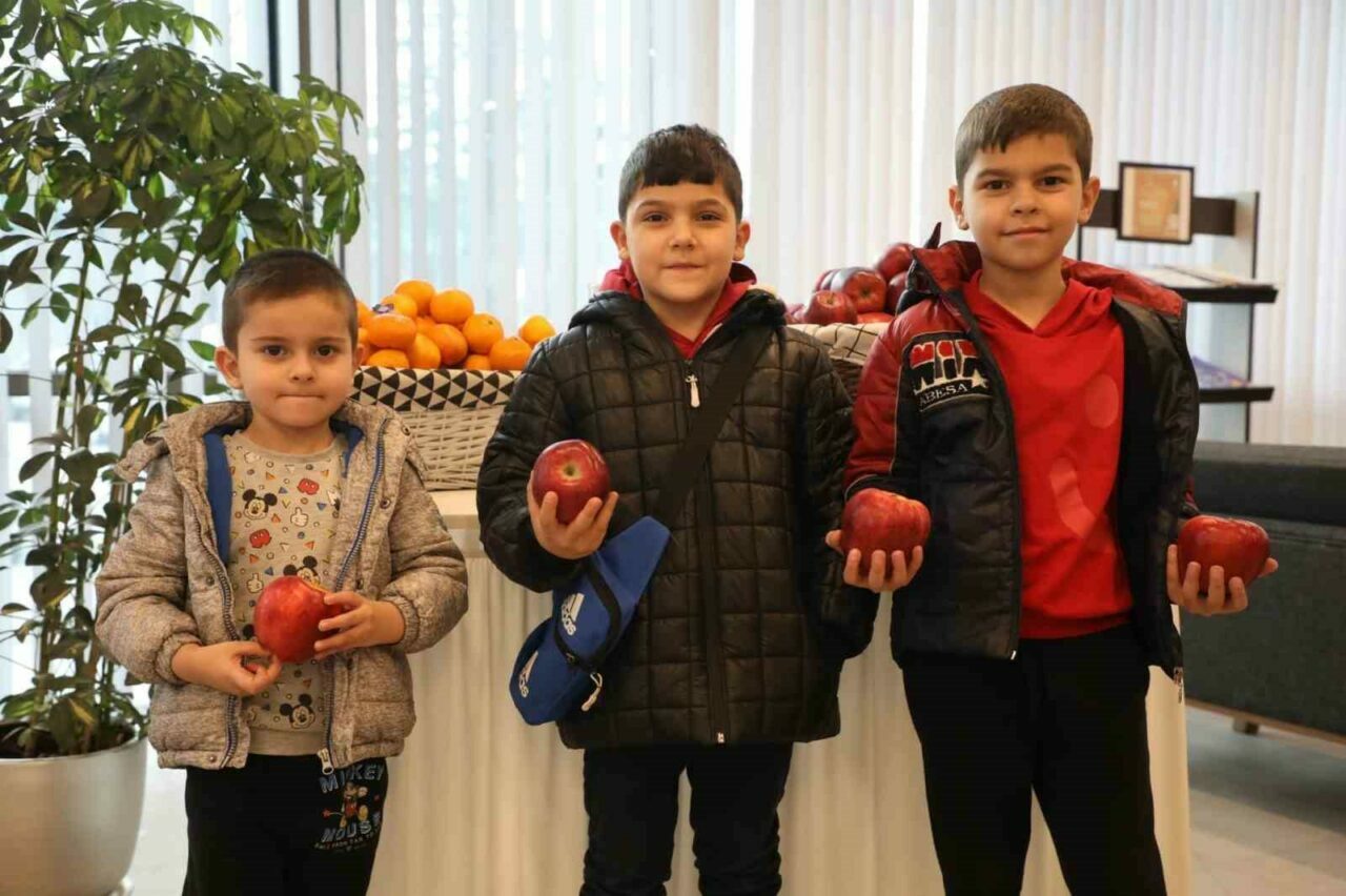 Elma ve mandalina gibi vitamin deposu meyveler, “Her vitamin bir net olsun” mesajıyla öğrencilere sunuldu. Bu anlamlı jest, hem öğrencilerin yüzünü güldürdü hem de çalışma motivasyonlarını artırdı.