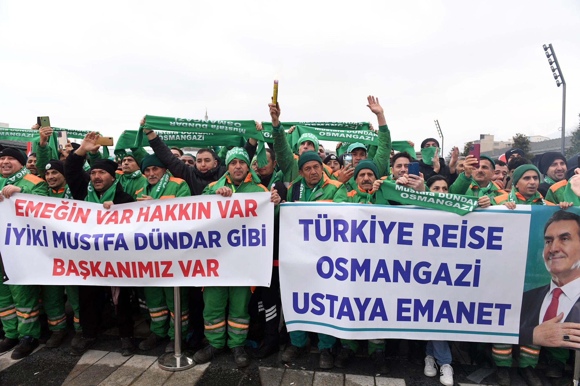Osmangazi Meydanı’nı dolduran işçilere hitaben konuşan Osmangazi Belediye Başkanı Mustafa Dündar, “İnşallah alacağınız ücret yağmur gibi bereketli olsun.” ifadelerini kullandı. Ek zammı vizyon proje Osmangazi Meydanı’nda açıkladıklarını belirten Başkan Dündar, “Osmangazi Belediyesi, büyük bir aile ve bu büyük aile sevgi ve kardeşlik, içinde yaşıyor. Bu büyük ailenin 14 Şubat Sevgililer Günü kutlu olsun. Bu sevginiz 14 Şubat’ta kalmasın, aileniz, arkadaşlarınız arasında daim olsun. Bu sevgimiz artsın ve büyüsün inşallah. Bu sevgi yumağı içinde belediyemizin yaptığı işler Osmangazi Belediyesi’ni bir cazibe merkezi haline getirdi. Osmangazi, bu sevgi ve saygı çerçevesi içinde büyük işler yapıyor. Osmangazi, daha temiz diyorsak bunun sebebi güler yüzlü ve çalışkan arkadaşlarımızdır. Ben emektar çalışanlarımızı kutluyor ve tebrik ediyorum.” dedi.