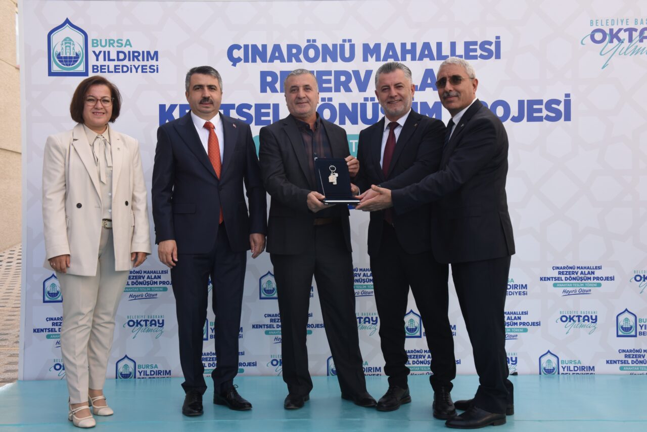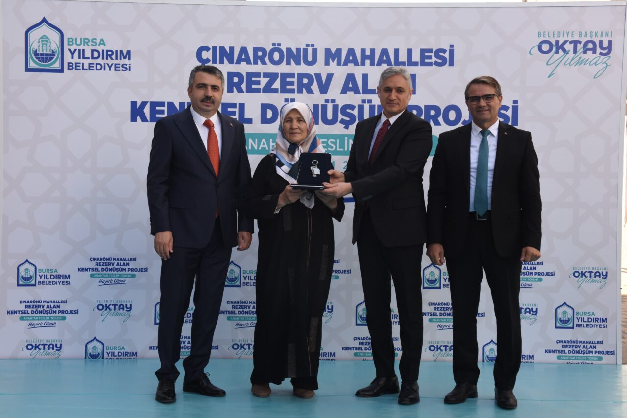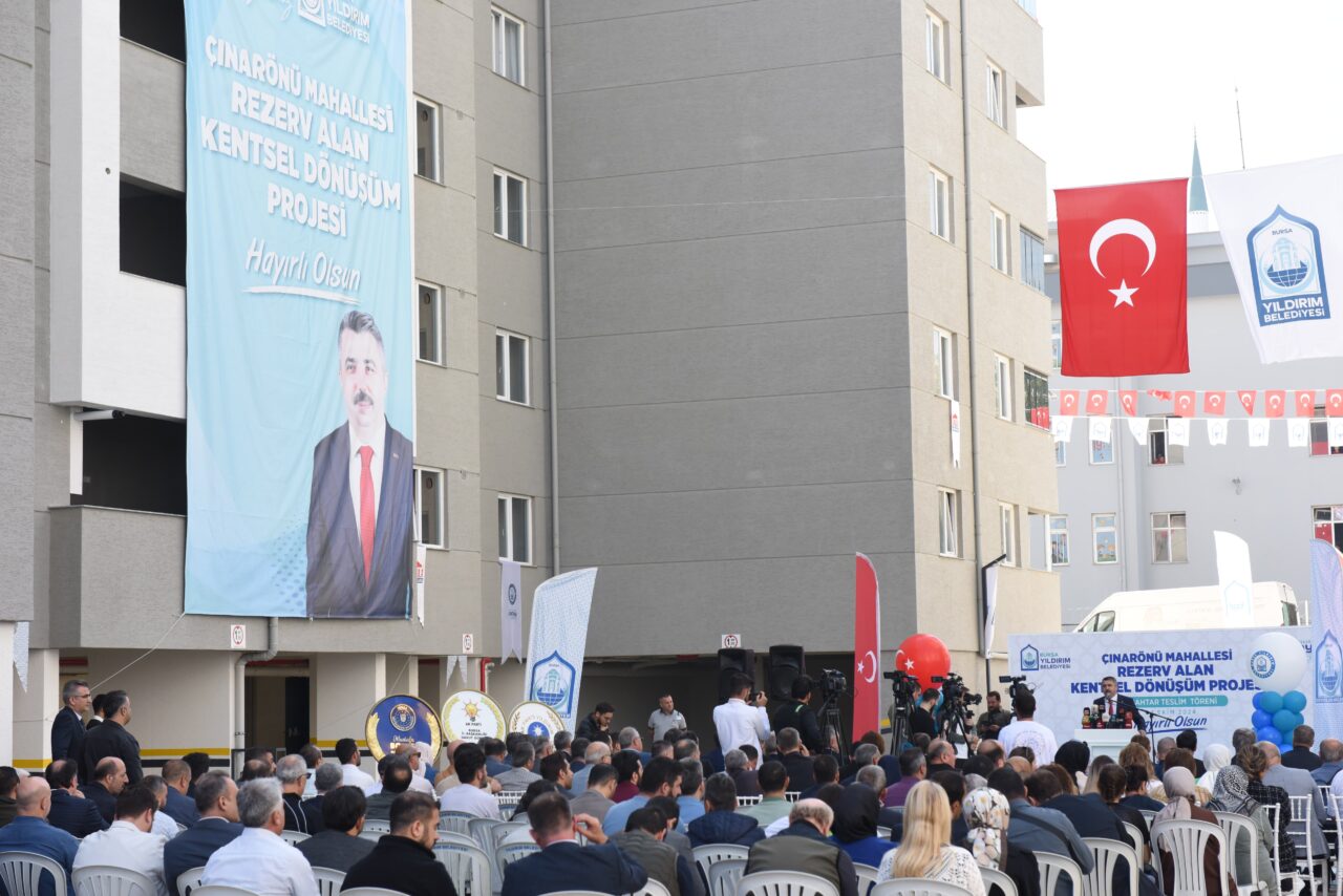 Yıldırım Belediyesi’nin Çınarönü Mahallesi Rezerv Yapı Alanı Kentsel Dönüşüm Projesi kapsamında yürüttüğü çalışmalar tamamlandı. Düzenlenen anahtar teslim törenine Yıldırım Belediye Başkanı Oktay Yılmaz’ın yanı sıra Yıldırım İlçe Kaymakamı Metin Esen, AK Parti Yıldırım İlçe Başkanı İrfan Akkaya, AK Parti İl Başkan Yardımcısı Fatma Şahin, Çevre ve Şehircilik İl Müdürü Mehmet Ersan Aytaç, İlçe Milli Eğitim Müdürü Mustafa Sevinç, İlçe Emniyet Müdürü Sakip Yalta, muhtarlar, meclis üyeleri ve hak sahipleri katıldı. 13 dönümlük alanda gerçekleştirilen çalışmalar sonucu 262 konut ve 8 idari birimin yanı sıra 8 bin 650 metrekarelik otopark, 2 bin 470 metrekarelik yeşil alan, 4 bin 380 metrekarelik alanda teknopark alanı bulunan Çınarönü Rezerv Alan Kentsel Dönüşüm Projesi, bölgedeki kentsel dönüşüm çalışmalarına örnek teşkil ederek Yıldırım’daki dönüşüm hamlesinde ivme kazandıracak.