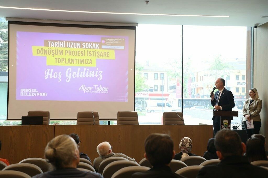 İnegöl Belediye Başkanı Alper Taban toplantıda yaptığı konuşmada projenin uygulanmasıyla birlikte tarihi dokusu korunarak yeniden şekillenecek olan Uzun Sokağın sadece estetik bir dönüşüm değil, aynı zamanda ticari hareketliliğin de artacağı bir alan haline geleceğini vurguladı. Başkan Alper Taban konuşmasında, gece gündüz tüm herkesin bu sokağa ilgisinin artacağını söyleyerek; ’’Uzun zamandır üzerinde çalıştığımız çarşı merkezimizin dönüşüm projesiyle ilgili istişare toplantısında esnaflarımızla bir araya gelmek istedik. Sadece Uzun Sokak olarak değil genel anlamda yapacağımız çalışmalarda konunun ilgilileri ile bir araya gelmeyi ve fikir alışverişinde bulunmayı önemsiyoruz. Ben yaptım oldu değil, birlikte yapalım olgusu üzerindeyiz. Çarşılarımız da gelenekten gelen alanlar. Bu alanların içerisinde güncellemeler yaparak yeniden daha güçlü bir şekilde vatandaşlarımızın tercih ettiği merkezler haline getirmek için çalışmalar yürütüyoruz. Görselliği, dahil edilecek donatı alanlarıyla da yeniden bir çekim gücü oluşturacağı düşüncesindeyiz. Mimar arkadaşlarımız ile proje üzerinde yapılan değerlendirmede 5 etap halinde çalışmaların yürütülmesini öngörülüyor. Uzun Sokağın zaten bir çekim gücü var ancak yapmak istediğimiz güncellemelerle bu çekim gücünü daha da güçlendirmek istiyoruz. Vatandaşlarımıza ‘’buranın havası değişmiş, muhakkak uzun sokağa da uğramalıyız’’ düşüncesini elde ettirmek istiyoruz. Projeyi etap etap gerçekleştirmek istiyoruz. Sarraflar Çarşısı, İshakpaşa Camii Çevresi gibi alanları da peyderpey dönüşüme dahil etmek istiyoruz. Bu bölgelerin gecesi ve gündüzüyle her halükarda vatandaşlarımızın geldiği uğrak noktalar olmasını istiyoruz’’ dedi.