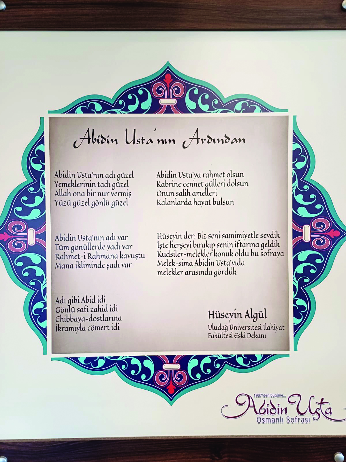 İşimizi sevmemize ve her sabah aynı inançla işe gelmemize bağlı bence. Kurucumuz Abidin Özen’in esnaflıktan gelip büyük bir şirkete dönüştürdüğü markamızın Bursa’da ürün ve hizmet üretmesinden dolayı ayrıca mutluyuz. Abidin Usta’nın faaliyet alanına baktığınızda, Osmanlı Mutfağı yemeklerini istikrarlı biçimde aynı lezzette üreten ve sunan bir işletme görürüz. 50 yılı aşkın süredir bu manada hizmet eden firma sayısı günden güne azalıyor ama biz sabırla ve ilk günkü şevkle işimize devam ediyoruz. Her gün 45-50 çeşit yemek çıkaran ve bunu birden fazla şubede başaran bir Bursa markası olarak gururluyuz.