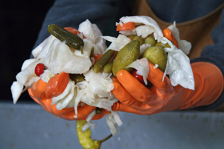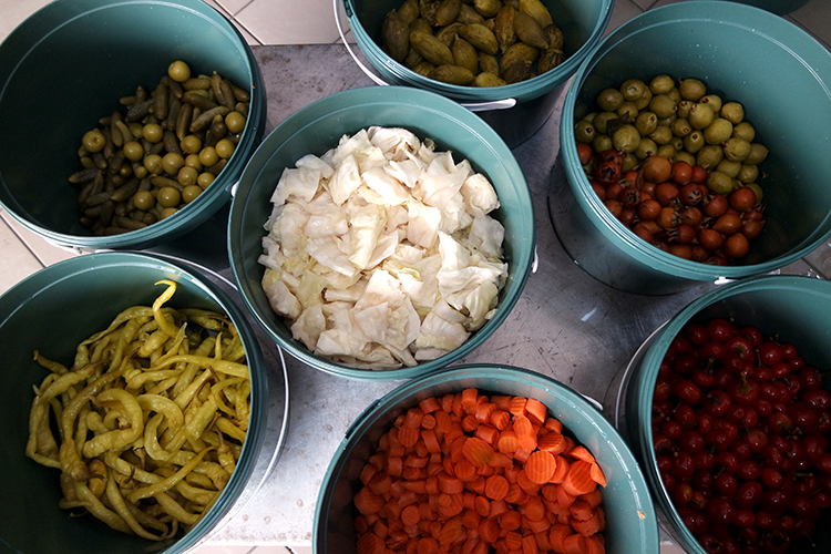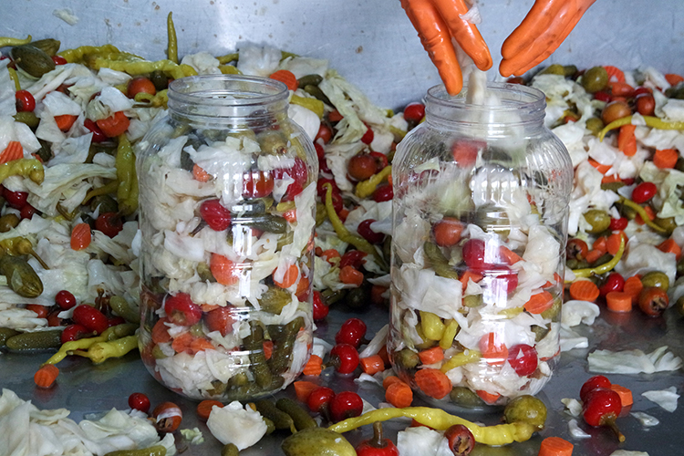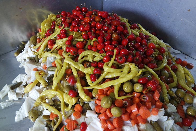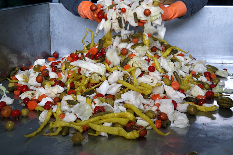 “Sebzemizin yaklaşık olarak yüzde 90-95’ini kurduk. Bir tek lahanamız var. Lahanamızı da dönem dönem yapıyoruz. Salatalık Afyonkarahisar, Balıkesir bölgesinden geliyor, İzmir bölgesinden de geliyordu ama artık çok nadir gelmeye başladı, bu bölgelerden alıyoruz. Lahanamız ve pancarımız Afyonkarahisar, havucumuz Konya’dan, acurumuz Gaziantep, Kahramanmaraş üzerinden geliyor. Keleğimiz Balıkesir, Gaziantep’ten geliyor. Yani aşağı yukarı Türkiye’nin her yerinden de sebze geliyor. Çanakkale bölgesinden acı biberimiz geliyor. Yine bunun yanında Balıkesir’den biber çeşitlerimiz geliyor.”