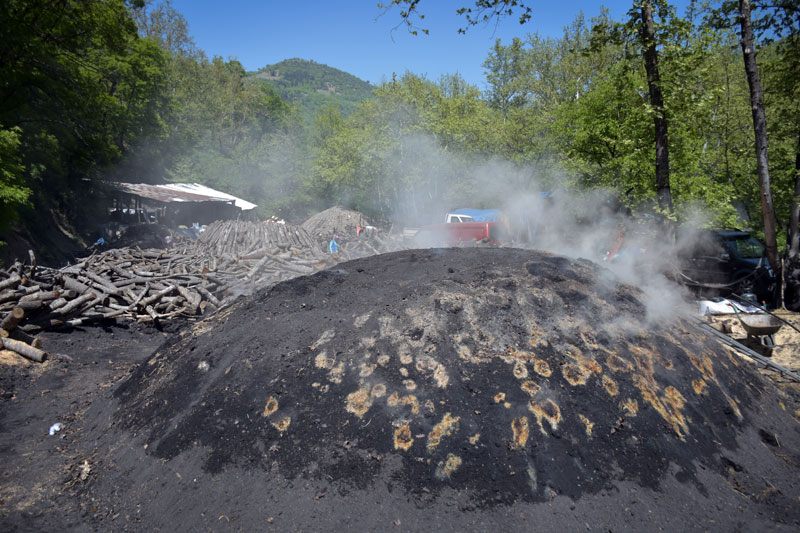 Ocaklarda çalışan aileler, kömür yapmak için toplanan odunları, önce dairenin ortasına dikilen uzun bir ağacın etrafında birbiri üzerine çatarak, daire genişleyene kadar diziyor. Daha sonra ağaç yapraklarıyla kapatılan odunların üzerini de toprakla örten köylüler, ocağı ortadaki ağacın çıkarılmasıyla oluşan ağızdan tutuşturup bu kısmı da toprakla kapatıyor.