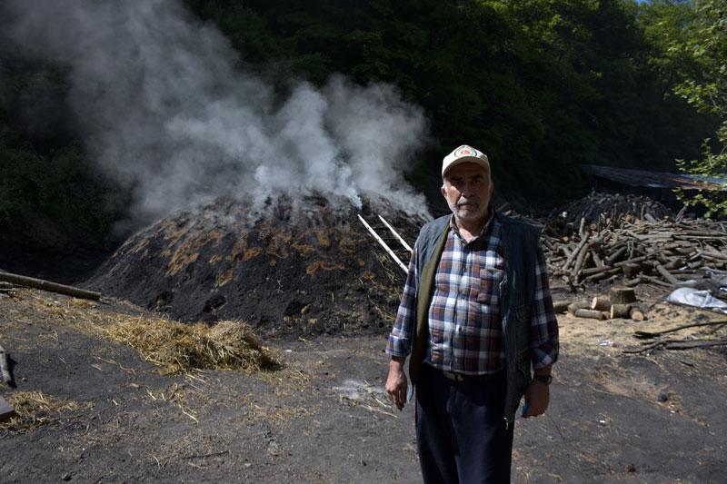 “Çok zor bir iş, gece gündüz başında durmak zorundayız. Ateş kaçar, orman yanar hem de zaiyatımız da çok oluyor. Nöbet tutmazsak deliniyor ocak. Delindiğinde ortasından yalazı çıkar ve ormanlar yanar. İkincisi de havalı yandığı zaman kalorisi düşer kömürün, kalori düşünce daha az kömür çıkar, 5 ton geleceğine mesela 4 ton çıkar. Bu da bizim cebimizden gidiyor. Bursa’ya veya talep olan her yere satabiliyoruz. Kalitesi, odunun yaş veya kuru olması, hızlı ya da yavaş yanmasına göre değişiyor. Biz hem bu çevrede meşe çok olduğu için hem de kalitesi iyi olduğu için bu ağaçtan yapıyoruz. Piynar ağacı daha kaliteli ama hem bu çevrede az, hem de onu nargileciler genelde tercih ediyor.”