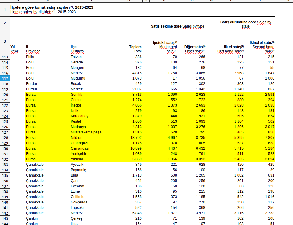 Osmangazi’de 10 bin 889, Yıldırım’da 5 bin 359, Mudanya’da 4 bin 313, İnegöl’de de 4 bin 66 konut satılmış…