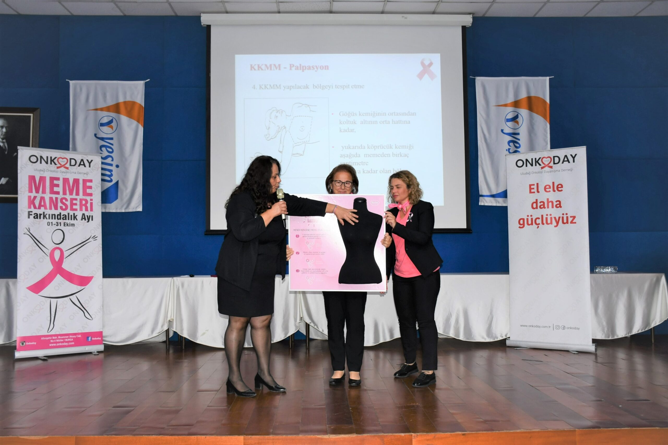 Söyleşinin başında maket üstünde kolay teşhis yöntemlerini uygulamalı olarak gösteren Hemşire Elif Pişkin, “Meme muayenesi 20 yaşından sonra her kadının alışkanlık haline getirmesi gereken önemli bir konu. Bir kadının ayda en az bir defa kendini muayene ederek memesini ve vücudunu tanıması gerekiyor. Memesini tanımayan birinin dokunduğunda memesindeki değişikliği ya da kitleyi anlayabilmesi biraz zor. Öte yandan meme muayenesi için en sağlıklı dönem, adetten bir hafta sonrası, yani 7. veya 10. gün. Adet görmeyen kadınlar ise her ay belirledikleri bir günde bu muayeneyi yapabilirler. Uygun zaman ve düzenli muayeneyle memede herhangi bir değişiklik söz konusuysa erken teşhis edilen farklıların tedavisi de kolay oluyor” diye konuştu.