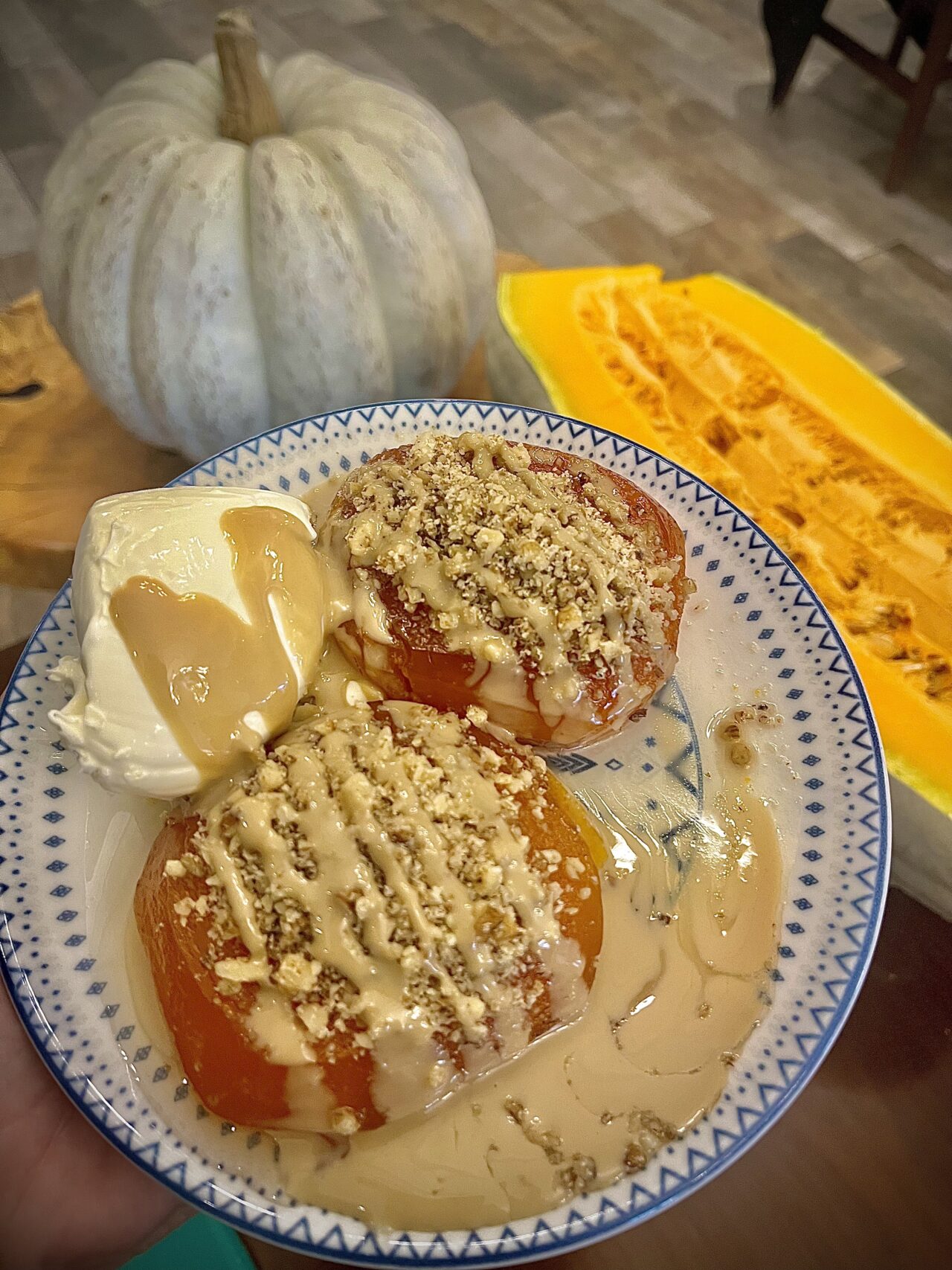 Malzemeler: Bal kabağı, toz şeker, limon, karanfil yeterli. Servis için kaymak, ceviz ve tahinin mutfakta olması gerekiyor.