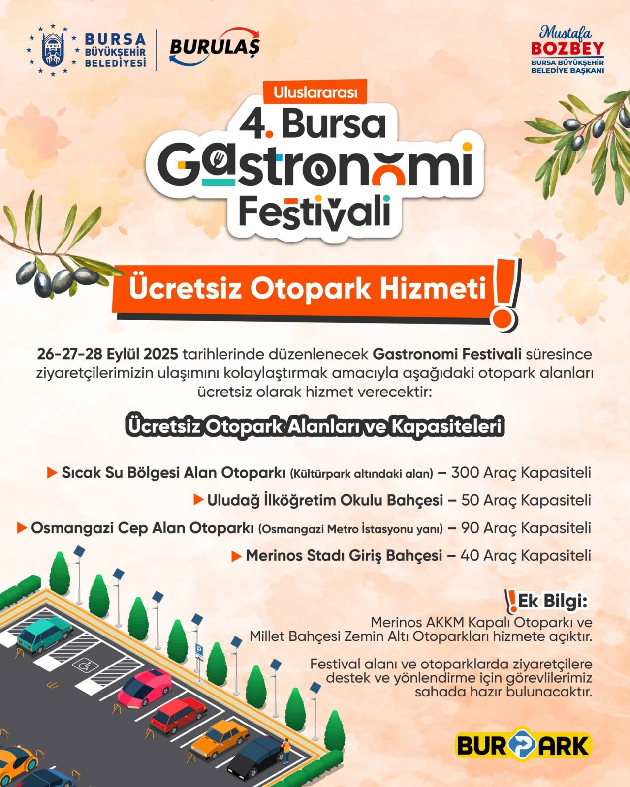 Bursa Büyükşehir Belediyesi iştiraklerinden BURULAŞ, 26-27-28 Eylül 2025 tarihlerinde Merinos Parkı’nda gerçekleşen Uluslararası 4. Bursa Gastronomi Festivali için ziyaretçilere ulaşım kolaylığı sağlamak amacıyla ücretsiz ring seferleri ve ücretsiz otopark hizmeti sunuyor.