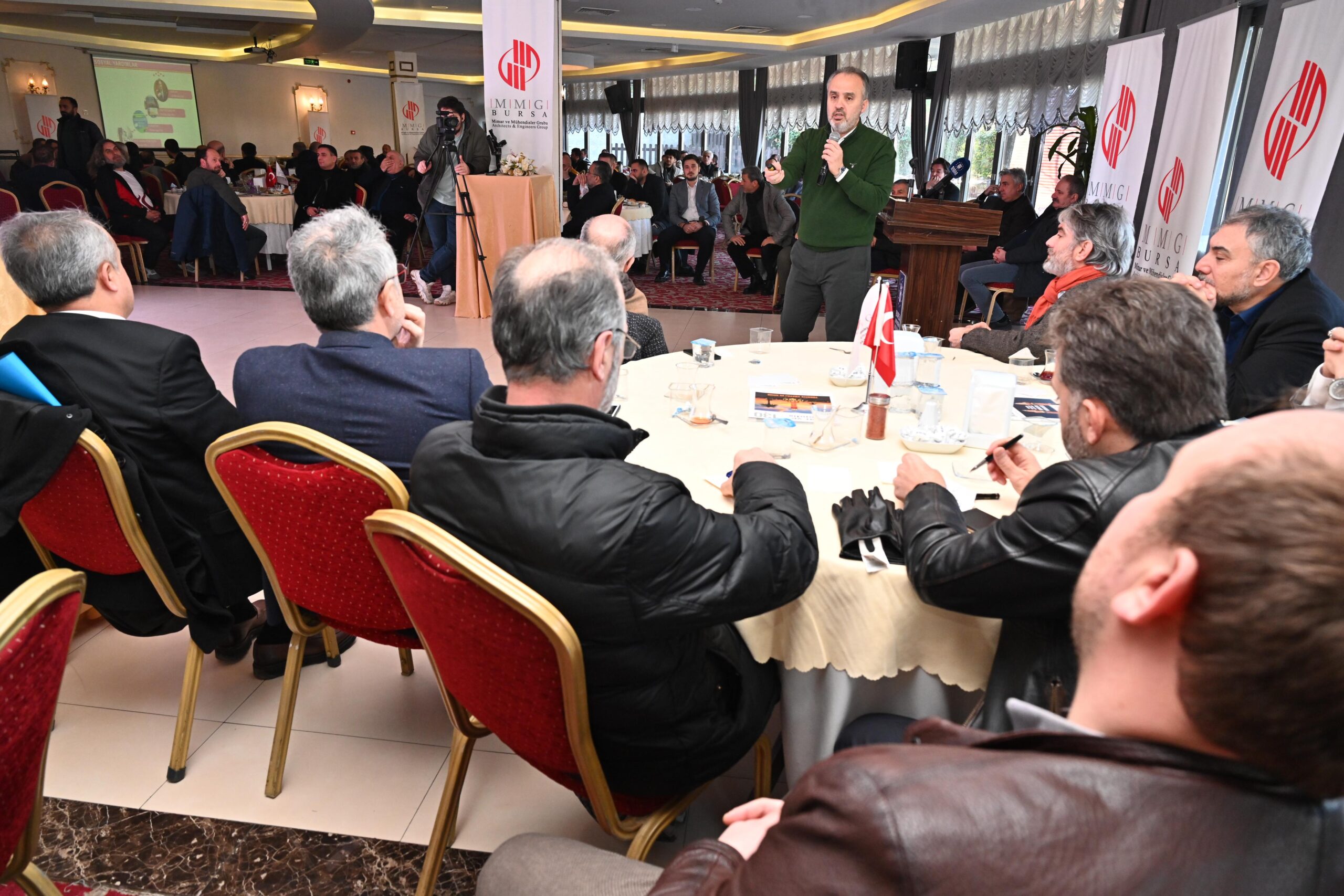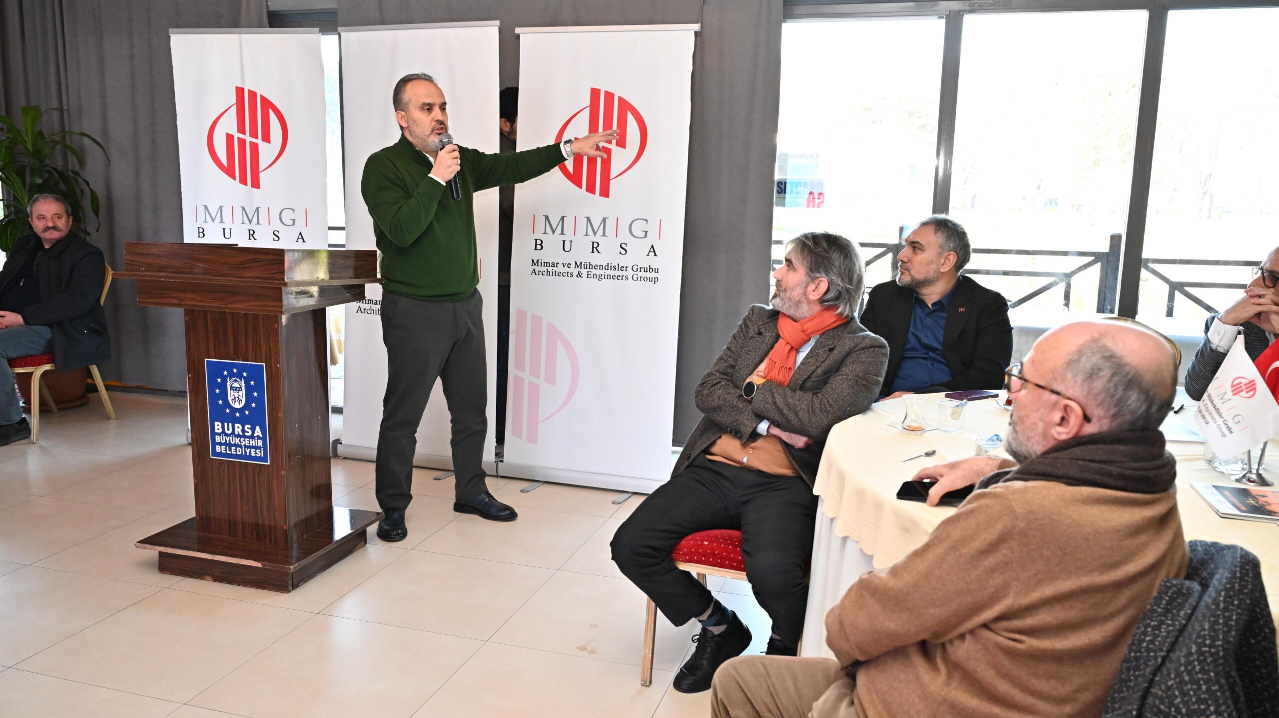 Şehitlere rahmet ve yaralı askerlere ise acil şifa dilekleri ile söze başlayan Bursa Büyükşehir Belediye Başkanı Alinur Aktaş, “Zor bir coğrafyada yaşıyoruz. Allah bir daha böyle acılar yaşatmasın” dedi. Mimar ve Mühendisler Grubuna davetleri için teşekkür eden Başkan Aktaş, “3.5 milyon nüfuslu bir şehirde yaşıyoruz. Trafik ve ulaşım bu şehrin en önemli konularından bir tanesi. Standartları yüksek, sanayi karakteristiği çok fazla ön plana çıkan bir şehir, Bursa. Tarih, kültür, turizm ve tarım gibi farklı başlıklar altında da Bursa çok kıymetli, özel ve özellikli bir şehir. Tüm bunların yanında çok hormonlu ve merkezde, hızlı büyüyen bir şehir. Bu bile başlı başına tartışılması gereken bir konu. Şehri ve şehrin sağlıklı gelişimini düşünmek zorundayız. Şehrin dönüşmesi gerekiyor. Ülke bir deprem kuşağında şehir zaten deprem kuşağında. 1855’deki depremden sonra yıkıcı deprem gözükmese de bunun için gereken hamleleri yapmamız lazım. Yeni dönem belediyeciliğinde iki konu var: ‘dirençli ve sağlıklı şehirler: kentsel dönüşüm’ ve ‘iklim değişikliği, kuraklık’. Bu iki başlığın çok ciddi alt başlıkları mevcut ve kesinlikle bu iki konuyla alakalı radikal tedbirler almamız gerekiyor. Sanayi, tarım, turizm planlamada, diğer şehir planlarının da çok doğru ve sağlıklı bir biçimde ayarlanması lazım. Biz en radikal adımları atmamız gereken dönemdeyiz. Bursa gibi ekonomik aktivitesi yüksek, dinamik bir şehirde hiçbir mazeretin ardına sığınmıyoruz, daha radikal adımları atıp şehirle alakalı dönüşümlerin ve gelişimin daha sağlıklı bir şekilde gerçekleşmesi adına elimizden geleni yapacağız. Buna dair tecrübe ve inancımız var” dedi.