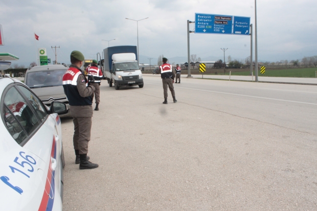 Bursa’nın doğu girişinde uygulamama yapan İnegöl İlçe Jandarma Komutanlığına bağlı ekipler, arabadan kamyona kadar her aracı tek tek durduruyor.