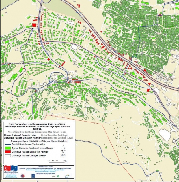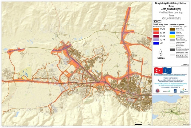 ‘Çevre ve Şehircilik Bakanlığı koordinasyonunda proje uzmanları ve Bursa Büyükşehir Belediyesi Çevre Koruma ve Kontrol Dairesi Başkanlığı personeli tarafından kara, demir yolu ve endüstri kaynaklarının değerlendirilmesi maksadıyla “stratejik gürültü haritaları” hazırlandı. Bütün gürültü kaynakları için gündüz, akşam ve gece zaman dilimlerini içeren 24 adet gürültü haritası elde edildi. Yönetmelik uyarınca haritalanacak yerleşim alanı 246 kilometrekare olarak belirlenirken, 222 bin 484 hassas kullanım içeren (konut, hastane ve okulu kapsayan ) bina için 1 milyon 854 bin 446 kişinin gürültüden etkilenme durumu değerlendirildi. 734 kilometre kara yolu, 309 kilometre ana kara yolu, 76 kilometre ana demir yolu gürültü kaynağı için gündüz, akşam ve gece zaman dilimlerini içeren ayrı ayrı stratejik gürültü haritaları hazırlandı.