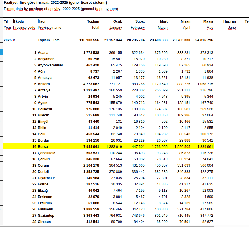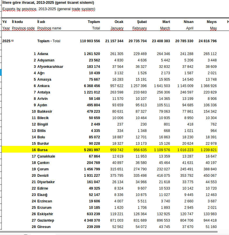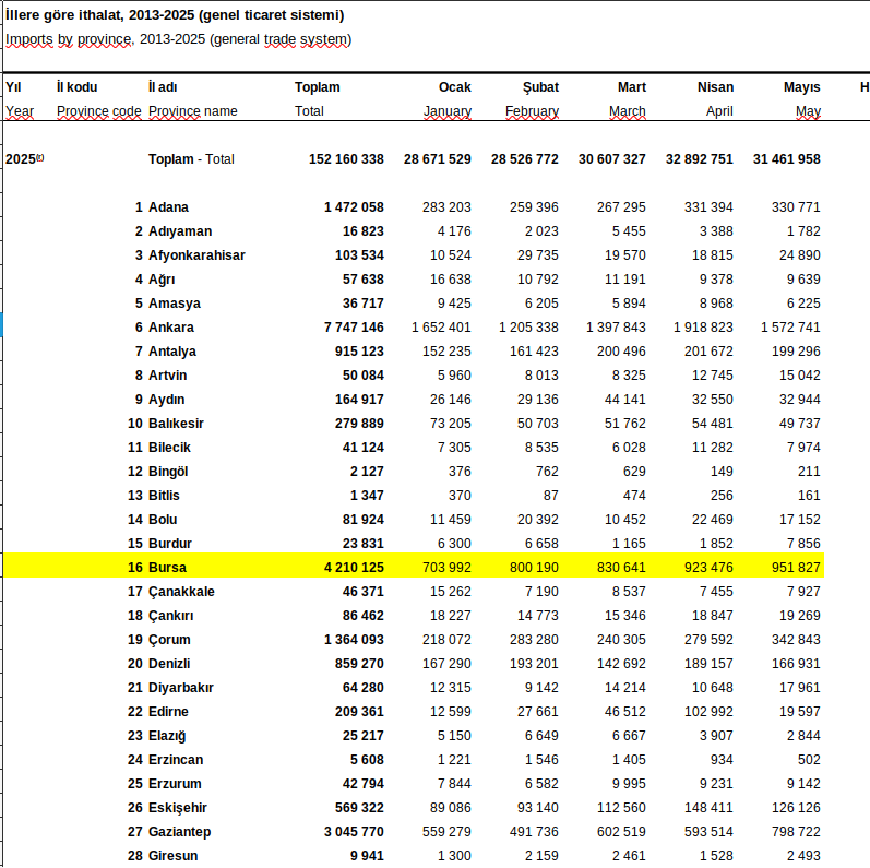 Bursa’da Ocak-Mayıs 2025 aylarında ise toplam ihracat 5 milyon 281 bin 997 lira, toplam ithalat da 4 milyon 210 bin 125 lira oldu…