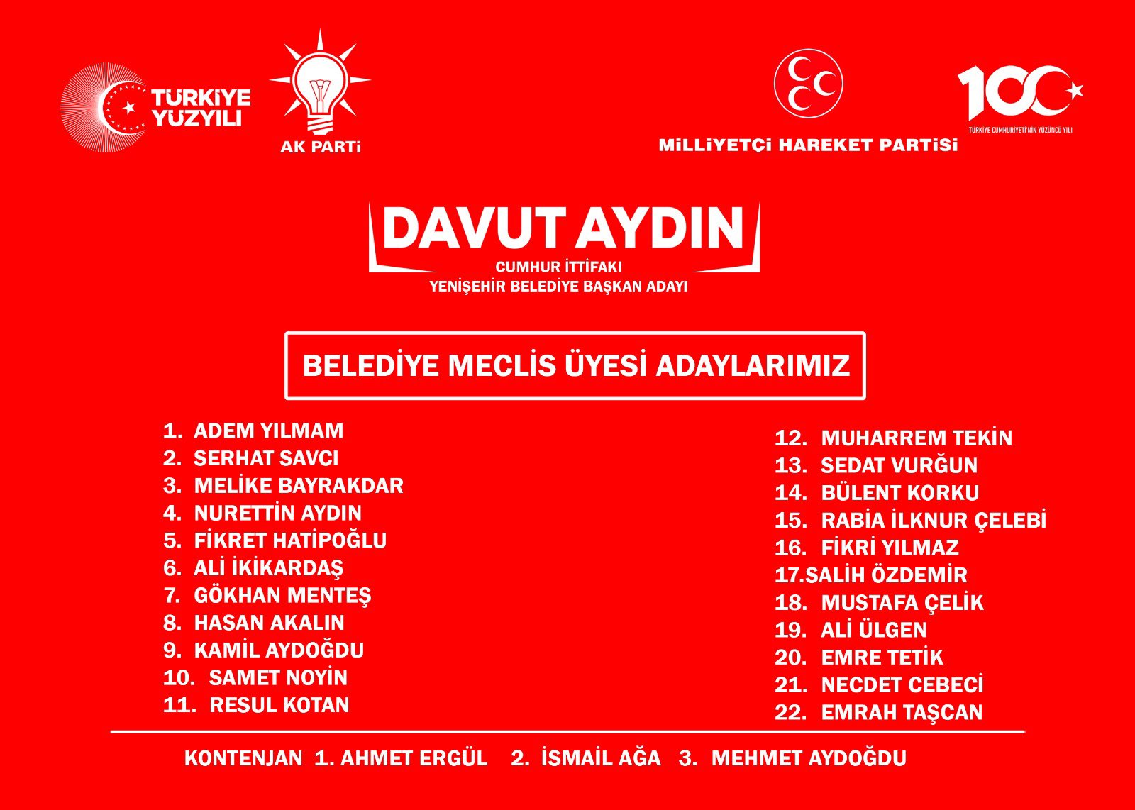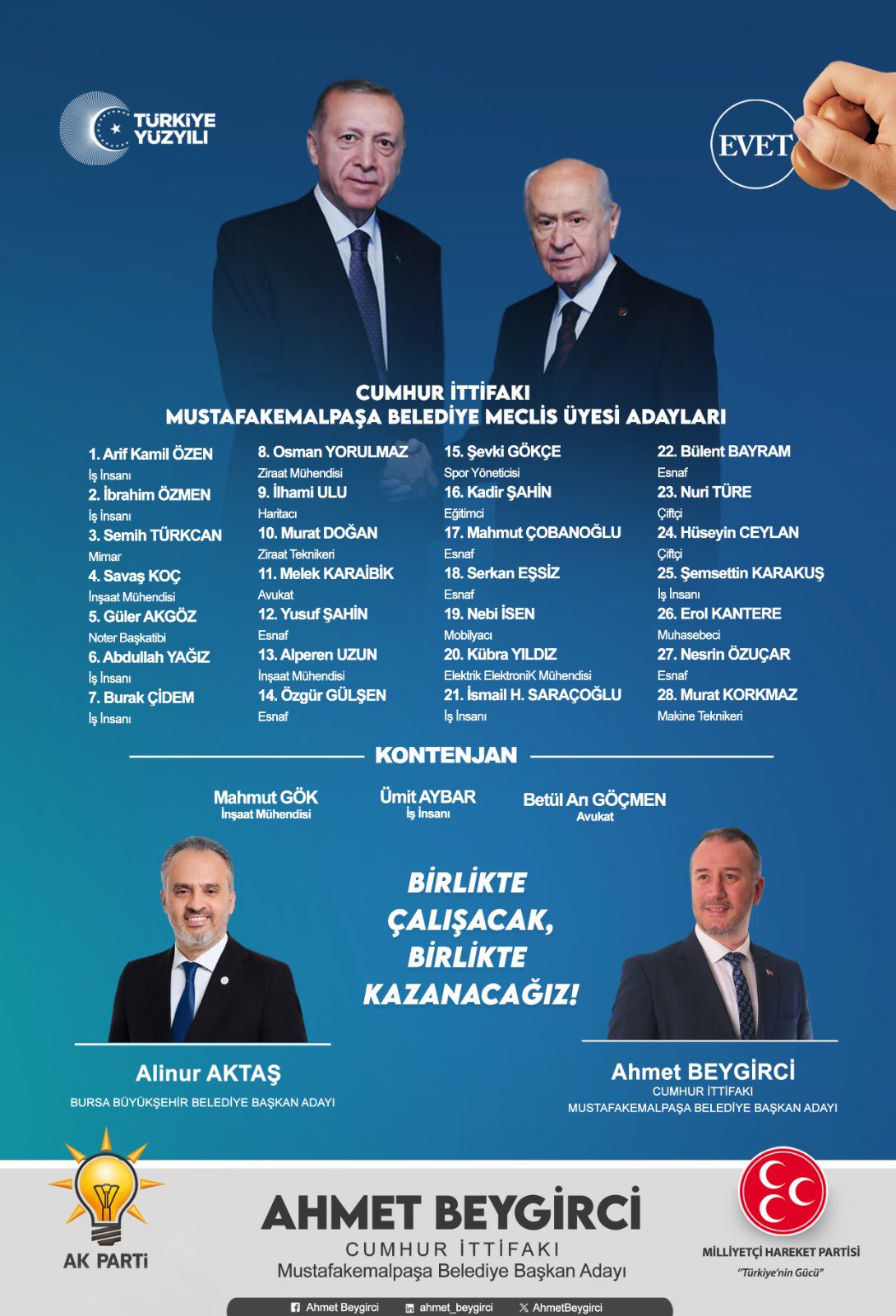 Cumhur İttifakı ortağı Milliyetçi Hareket Partisi’nin Bursa’da belediye başkan adayı çıkardığı Yenişehir ve Mustafakemalpaşa’daki Meclis Üyesi adayları da açıklandı…