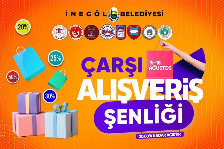 İnegöl Belediyesi öncülüğünde İnegöl Ticaret ve Sanayi Odası, Terziler Odası, Lokantacılar Odası, Madeni Sanatkarlar Odası, İnegöl Kuyumcular Derneği, Kahveciler Odası ve Elektrikçiler Odasının katkı ve destekleriyle 4 gün sürecek Çarşı Alışveriş Şenliği düzenlenecek. 15 Ağustos Perşembe günü başlayıp 18 Ağustos Pazar akşamı sona erecek 4 günlük alışveriş şenliğinde, yüzde 50’ye varan indirimlerle İnegöl çarşısı bereketlenecek. Şenlik süresince gece 00.00’a kadar çarşı bölgesinde iş yerleri açık olacak. Esnaflar da bayram arefelerinde olduğu gibi kapı önlerinde tezgah açabilecek. Şenlik boyunca çarşı bölgesinde kültür sanat etkinlikleri de olacak.