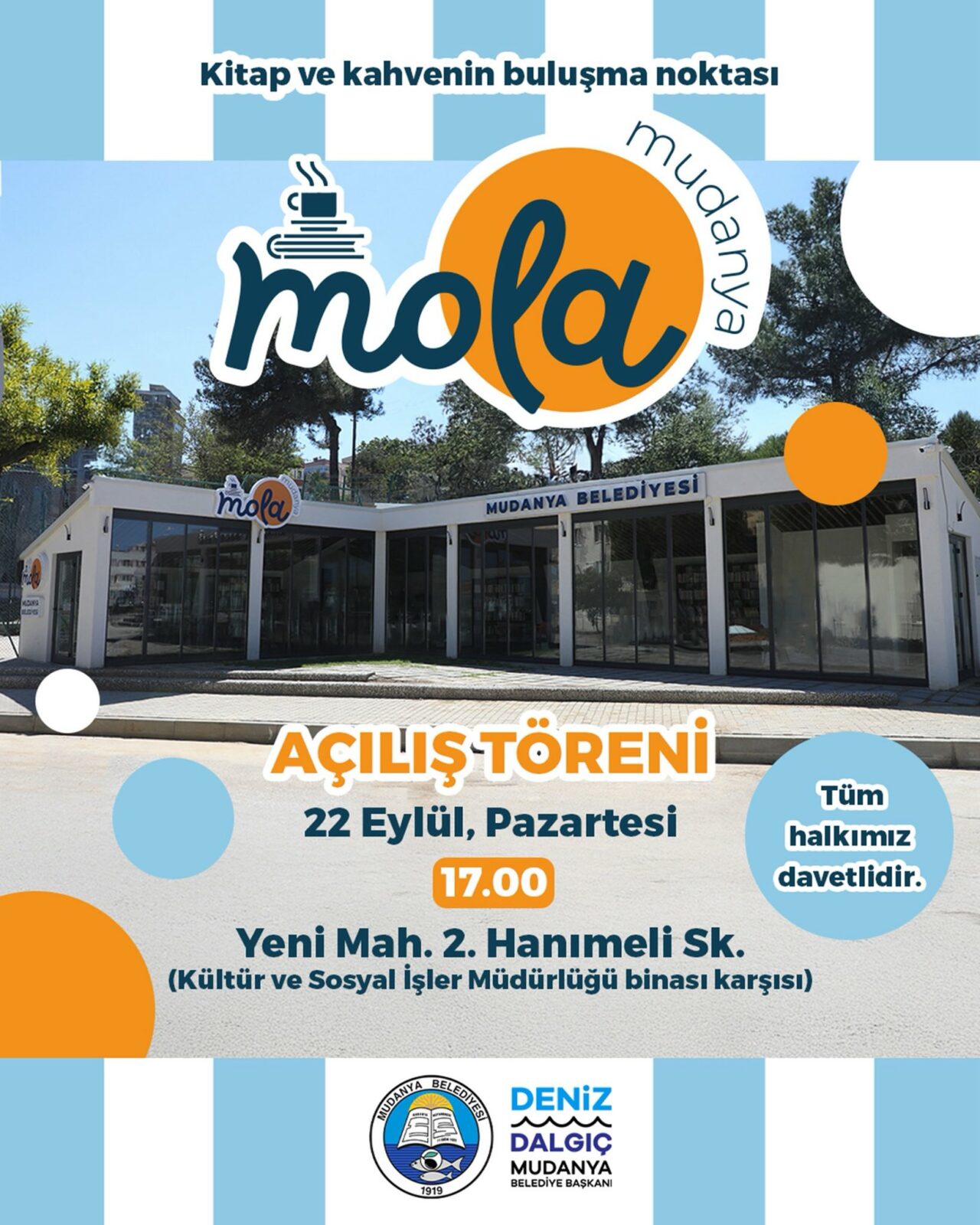 Belediye’den yapılan açıklamaya göre; kitap okuma, ders çalışma ve kahve eşliğinde sohbet etme imkânı sunacak “Mola Mudanya”, 22 Eylül Pazartesi günü saat 17.00’de açılacak.
