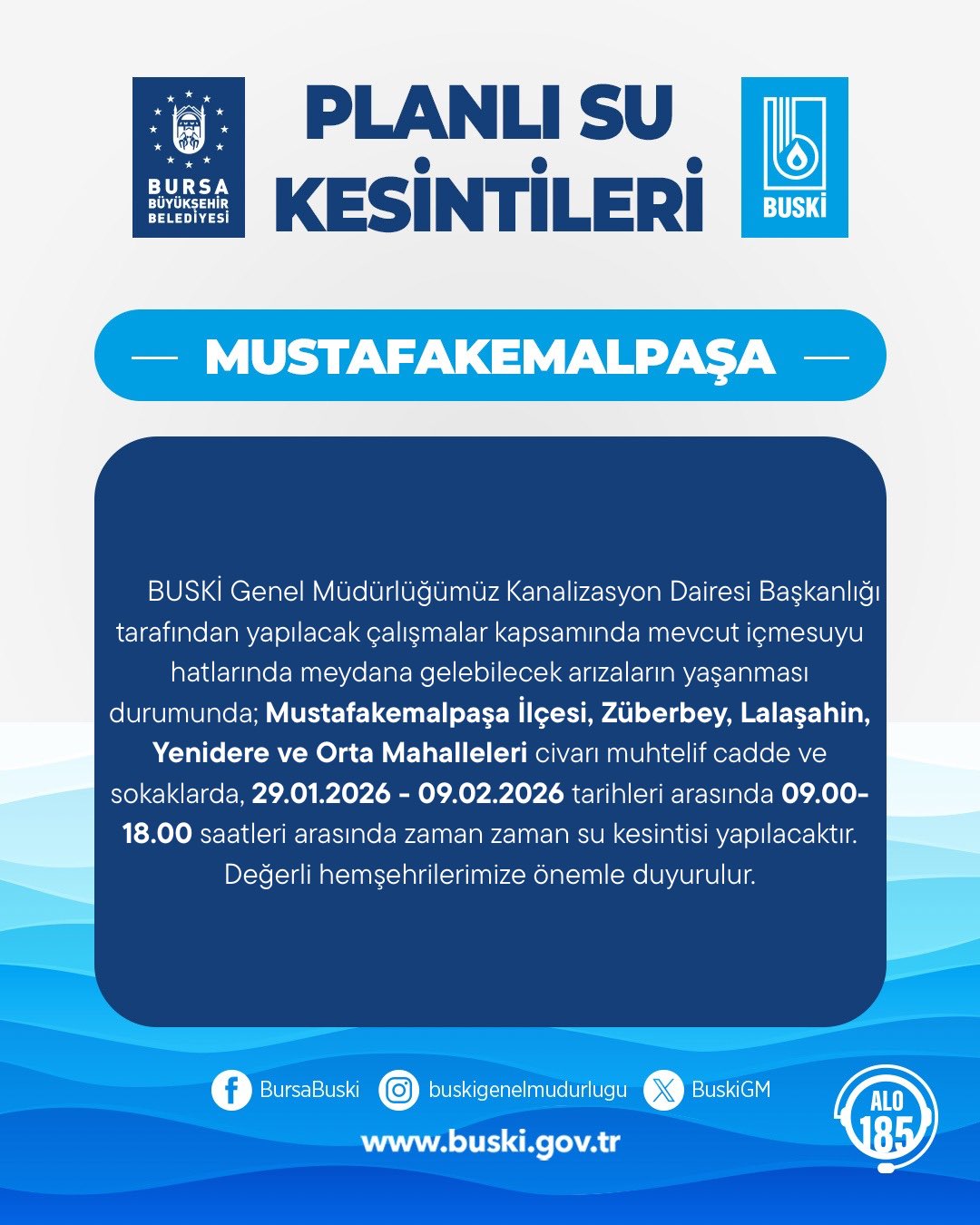 “BUSKİ Genel Müdürlüğümüz Kanalizasyon Dairesi Başkanlığı tarafından yapılacak çalışmalar kapsamında mevcut içmesuyu hatlarında meydana gelebilecek arızaların yaşanması durumunda; Mustafakemalpaşa İlçesi, Züberbey, Lalaşahin, Yenidere ve Orta Mahalleleri civarı muhtelif cadde ve sokaklarda, 29.01.2026 – 09.02.2026 tarihleri arasında 09.00- 18.00 saatleri arasında zaman zaman su kesintisi yapılacaktır. Değerli hemşehrilerimize önemle duyurulur.”
