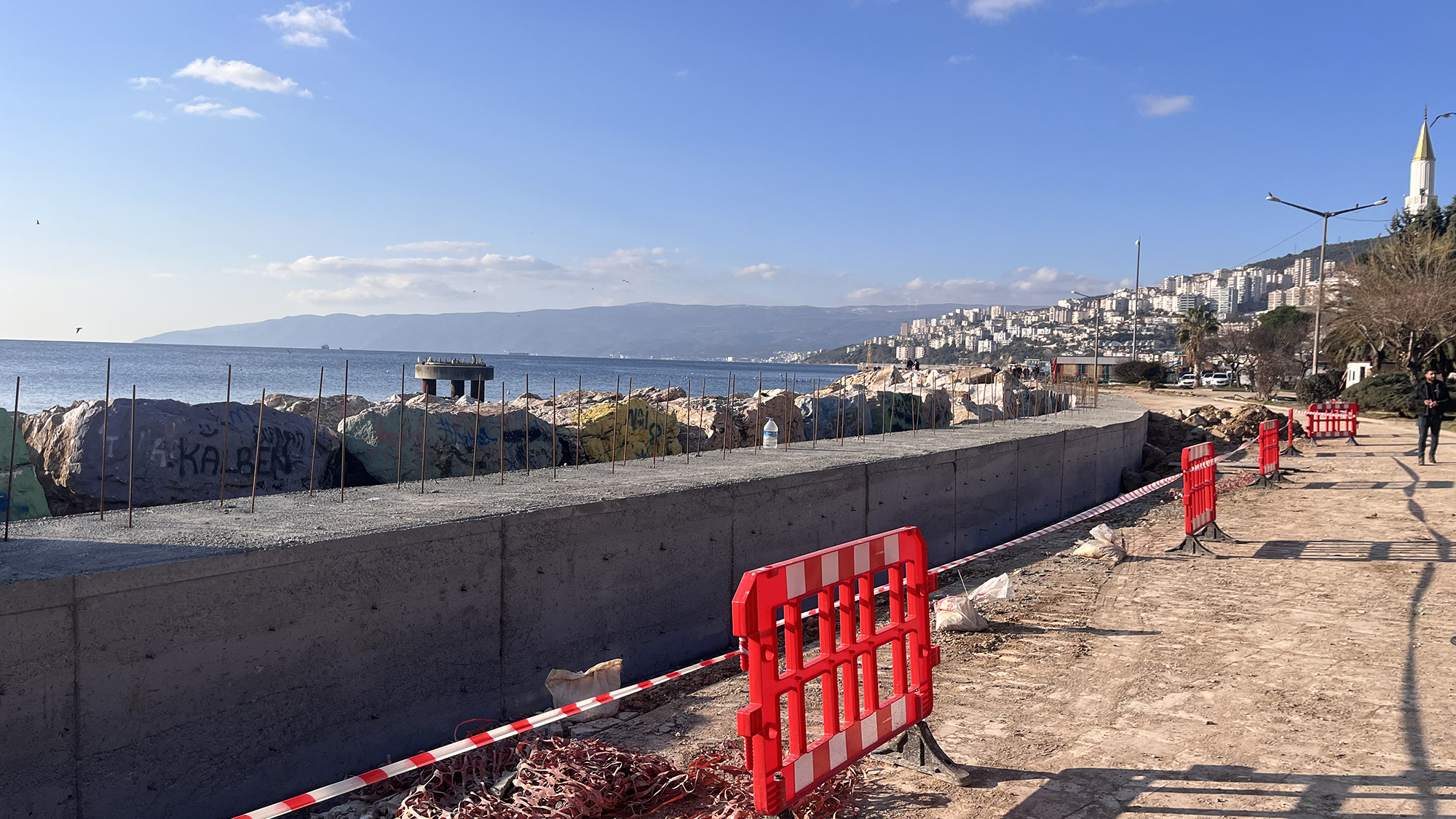 Büyükşehir Belediyesi Park ve Bahçeler Daire Başkanlığı teknik ekipleri tarafından deniz taşkınını önlemek adına başlatılan kıyı koruma çalışmaları hızla sürüyor.