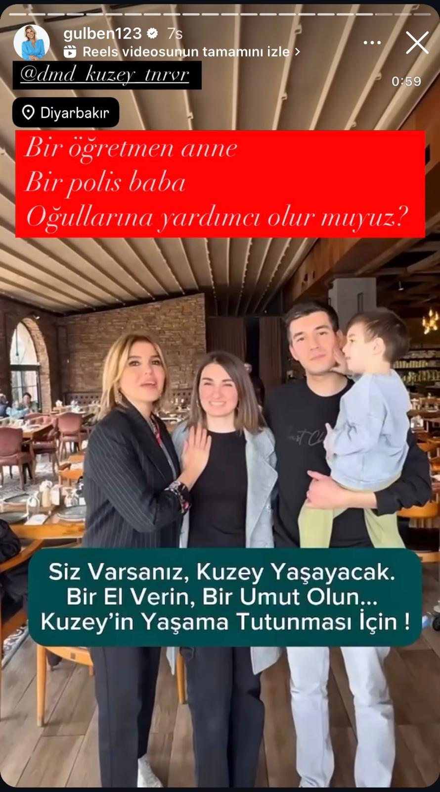 Daha önceden Bursa’da yaşayan ancak baba Armağan Tanrıöver’in görevi gereği Diyarbakır’da ikamet eden Tanrıöver ailesiyle buluşan Gülben Ergen, sosyal medya hesabından yaptığı paylaşımda ”Öğretmen anne ve polis babanın birtanecik oğulları Kuzey, bizim de evladımız. Kuzey’e DMD adı verilen bir misafir geldi. Onun bir an önce gitmesini istiyoruz. Ancak misafiri uğurlamamız çok pahalı. Hele ki Ramazan ayında iyilik yapmak, sevap işlemek için yer arayan herkesin elinden geleni yapacağına inanıyorum” ifadelerini kullanarak, Kuzey’in valilik onaylı bağış kampanyası için takipçilerinden destek istedi.