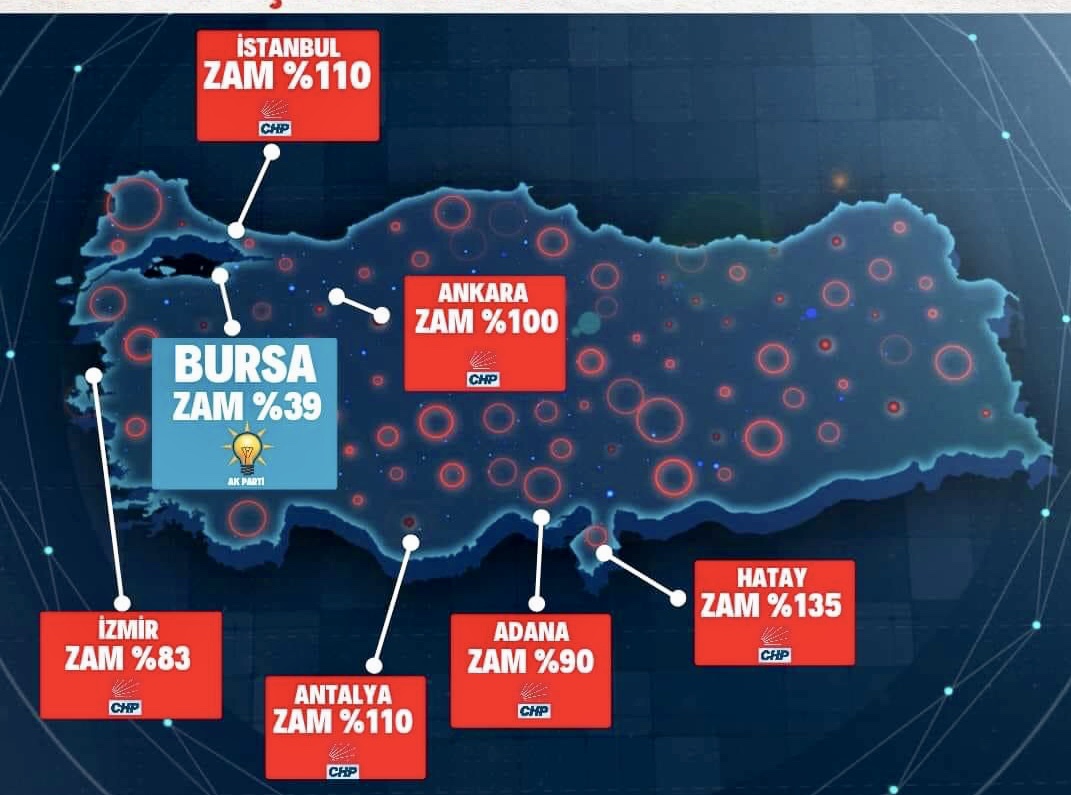 AK Partili Bursa Büyükşehir Belediyesi yönetiminin o haritada 7 büyük kent içinde pandemi öncesi ve sonrası geçen iki yıllık süreçte yüzde 39 oranında kentiçi toplu taşıma ücretlerini artırdığı görülürken, bu oranın CHP’li Hatay’da yüzde 135, İstanbul ve Antalya’da yüzde 110, Ankara’da yüzde 100, Adana’da yüzde 90 ve İzmir’de yüzde 85 seviyesinde gerçekleştiği görülüyor.