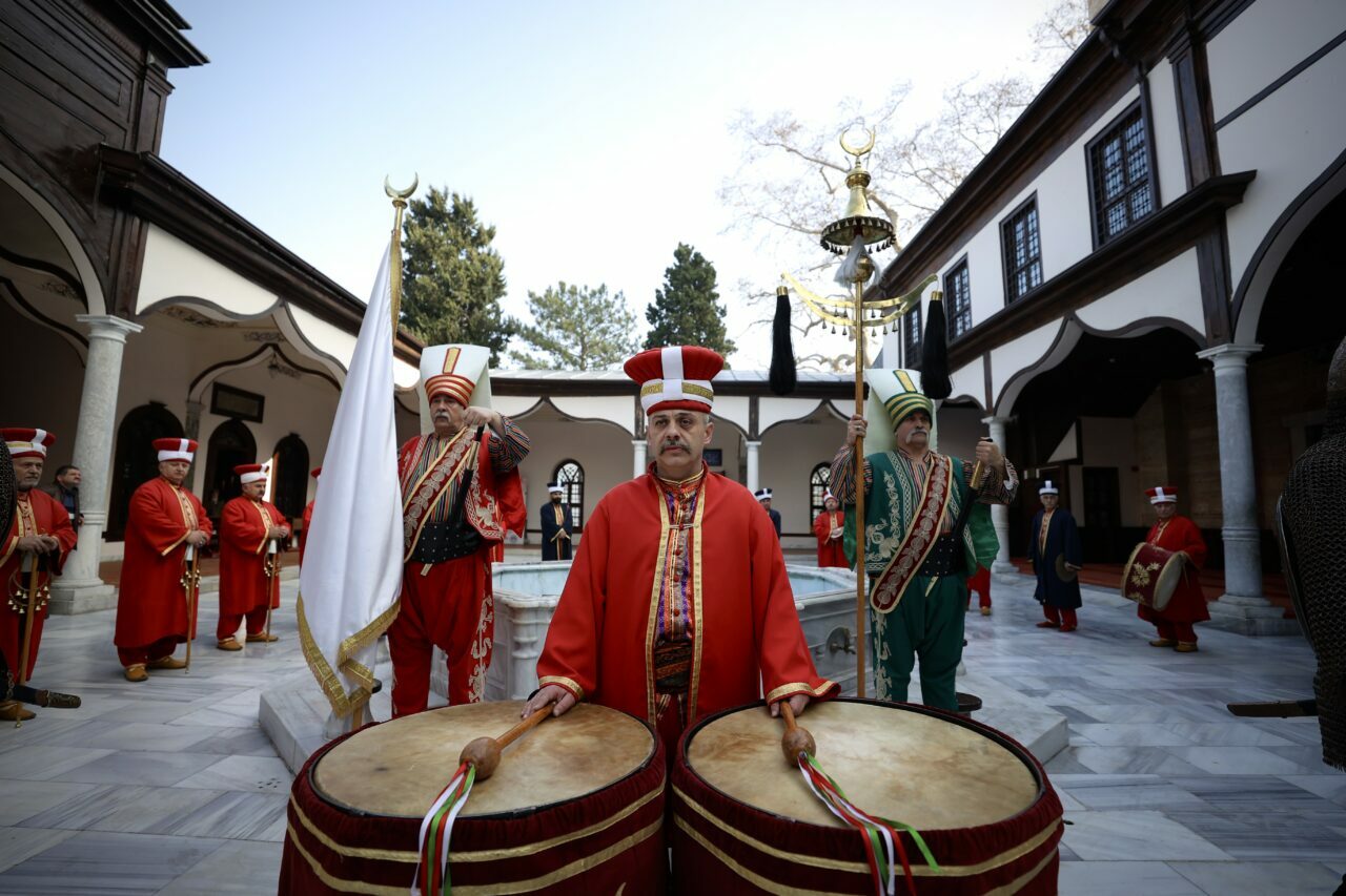 Merinos Atatürk Kongre ve Kültür Merkezi’ndeki mehterhanede faaliyetine devam eden Bursa Mehter Takımı’nda gönüllü yer alan 18-75 yaşlarındaki memur, esnaf, öğretmen, dişçi gibi meslek gruplarından, işçi ve memur emeklilerinden, müzisyenlerden oluşan 65 kişi, sancaklarını parlatıyor, giyiniyor, ayakkabılarını boyuyor ve zırhların bakımını yaparak gidecekleri etkinliklere hazırlanıyor.
