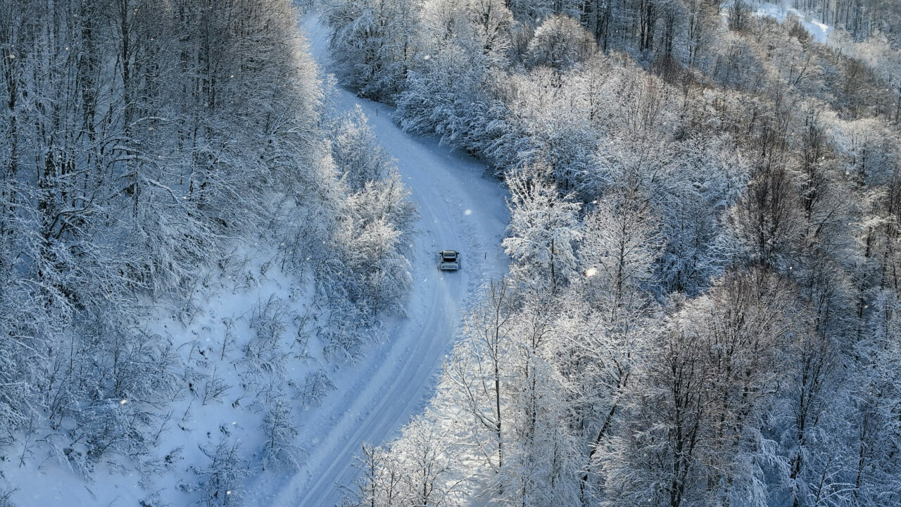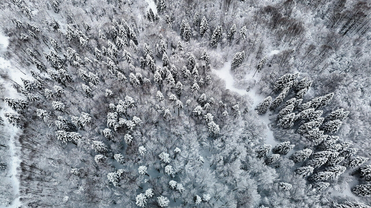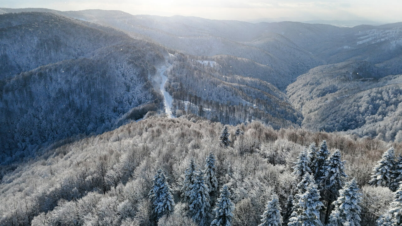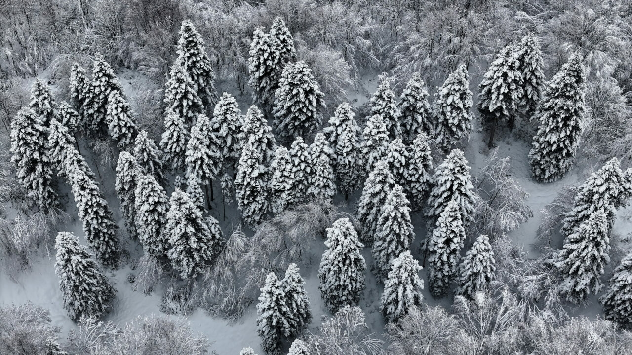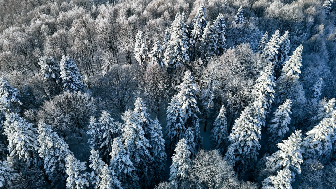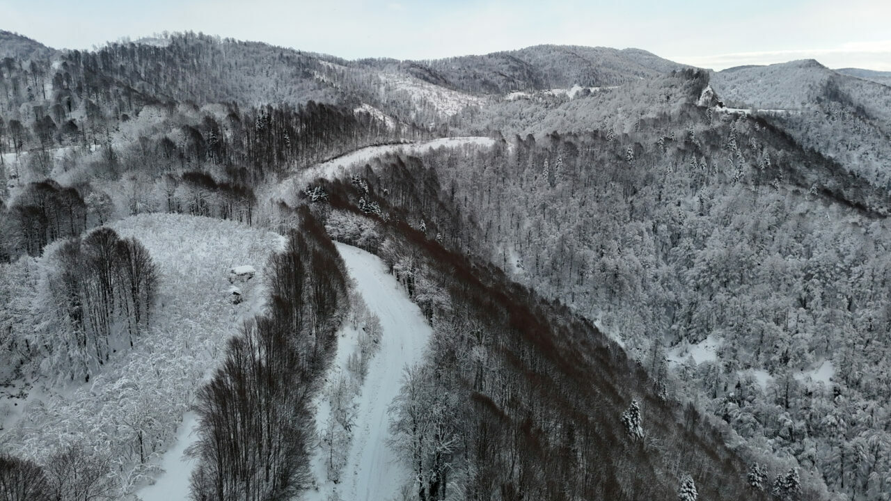 Çam, kestane, akasya, köknar ve gürgen ağaçlarının arasında yolculuk imkanı sunan Çam Dağı’ndaki beyaz örtü havadan görüntülendi.