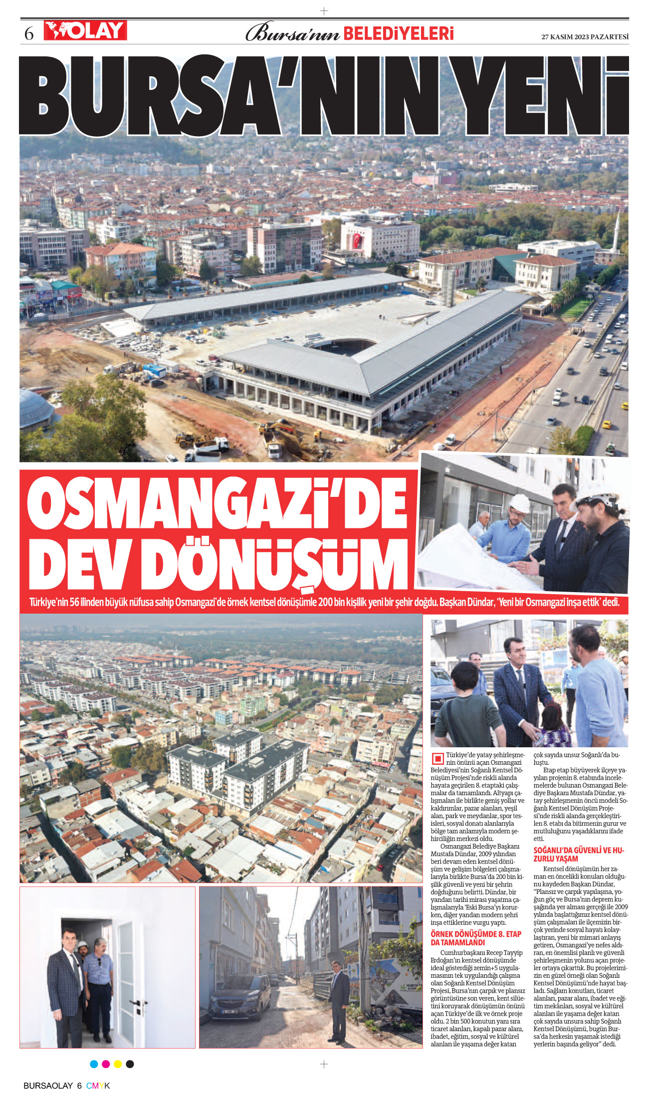Osmangazi Belediye Başkanı Mustafa Dündar, 2009 yılından beri devam eden kentsel dönüşüm ve gelişim bölgeleri çalışmalarıyla birlikte Bursa’da 200 bin kişilik güvenli ve yeni bir şehrin doğduğunu belirtti. Dündar, bir yandan tarihi mirası yaşatma çalışmalarıyla ‘Eski Bursa’yı korurken, diğer yandan modern şehri inşa ettiklerine vurgu yaptı.
