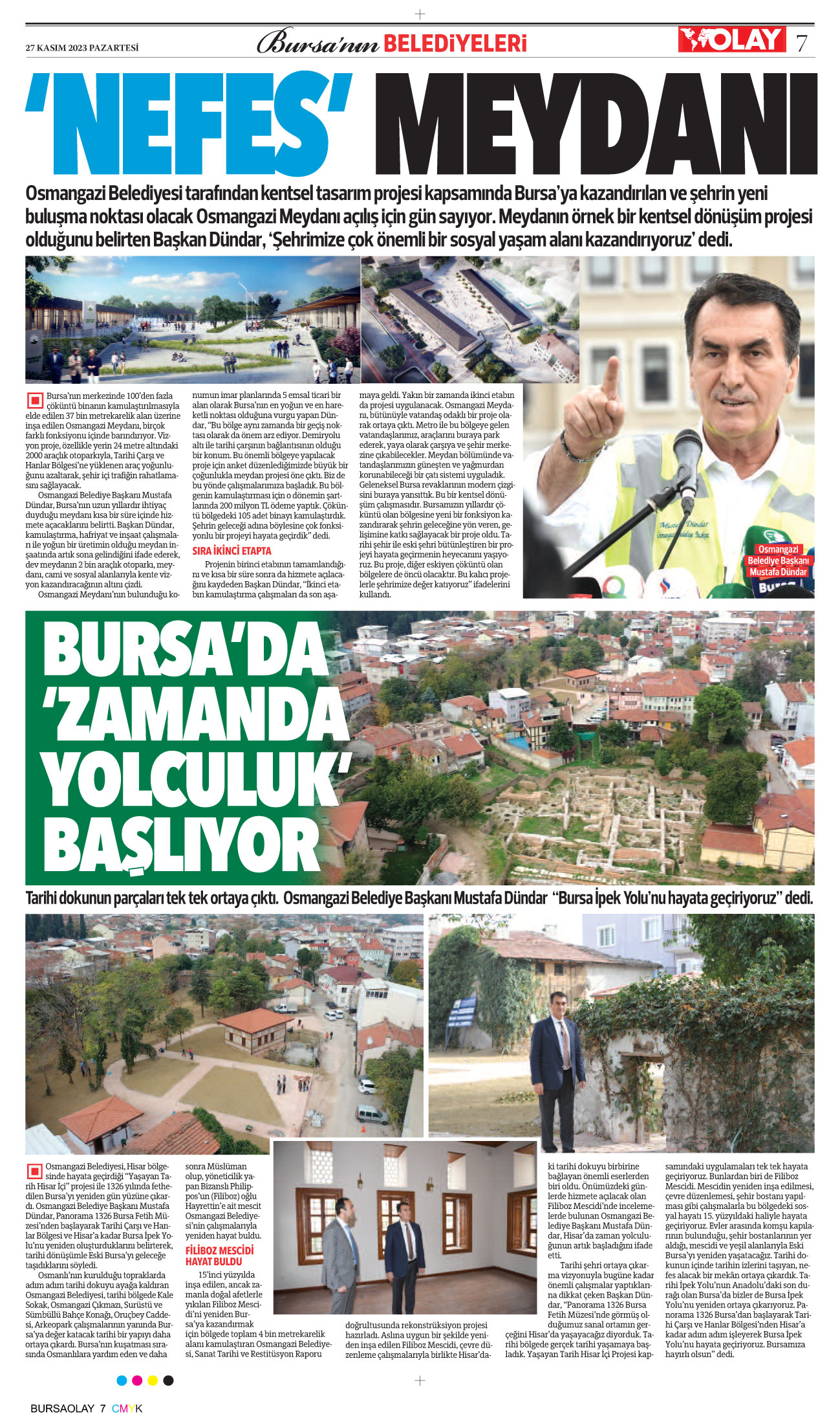 Osmangazi Belediyesi, Hisar bölgesinde hayata geçirdiği “Yaşayan Tarih Hisar İçi” projesi ile 1326 yılında fethedilen Bursa’yı yeniden gün yüzüne çıkardı. Osmangazi Belediye Başkanı Mustafa Dündar, Panorama 1326 Bursa Fetih Müzesi’nden başlayarak Tarihi Çarşı ve Hanlar Bölgesi ve Hisar’a kadar Bursa İpek Yolu’nu yeniden oluşturduklarını belirterek, tarihi dönüşümle Eski Bursa’yı geleceğe taşıdıklarını söyledi.