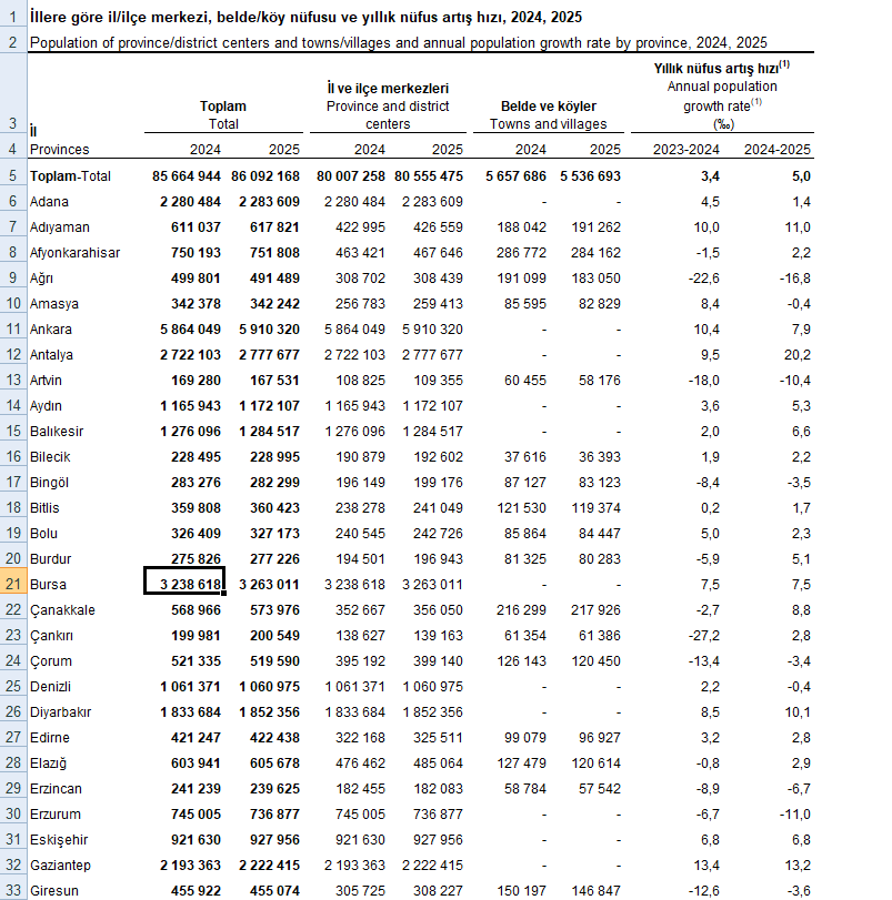 Buna göre Bursa’nın nüfusu 2025 yılı itibarıyla 3 milyon 263 bin 11 oldu.