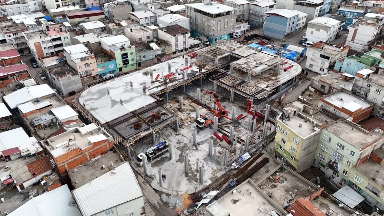 Yıkılan pazar alanının yerinde, 4 bin 500 metrekare taban alanı üzerine, 7 bin 200 metrekare inşaat alanına sahip olacak yapı, zemin üstü bir kat olarak inşa ediliyor.