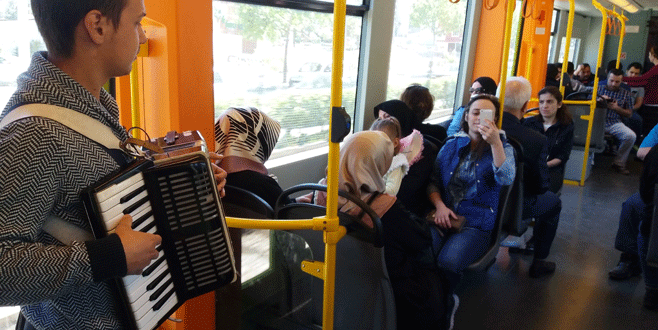Emek’ten Arabayatağı istikametine 10.55 sıralarında seyir halinde olan metroya 2 genç bindi. Gençlerden biri akordeonla müzik çalarken, hamile olan kız da elindeki bardağı vatandaşlara uzatarak para topladı. Koridorda müzik çalan gençler, yolcuların verdiği bahşişleri topladı.