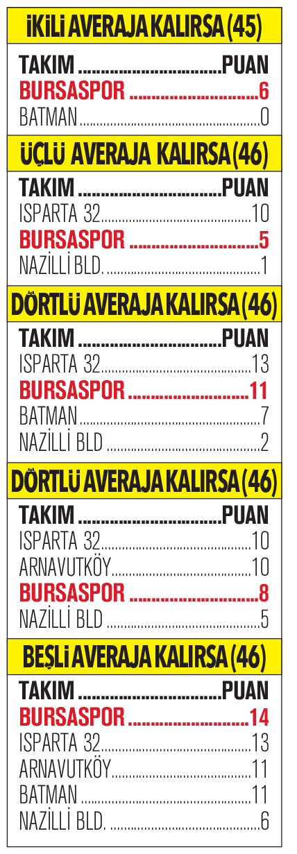 Yeşil beyazlı ekibin olası Nazilli Belediyespor yenilgisinde ise gözler Şanlıurfaspor-Batman Petrolspor maçında olacak. İnegölspor ile Isparta 32’nin küme düşen Tarsus ve Sivas Belediye ile oynayacağı maçlarda 3’er puan alarak ligde kalmayı garantilemelerine kesin gözüyle bakılıyor. Bu nedenle Bursaspor, Nazilli deplasmanında kaybederse, Batman Petrolspor’un Şanlıurfa’da mağlup olmasını bekleyecek. Bu durum gerçekleşirse iki takım da 45 puanda kalacak ve ikili averaj sonunda Bursaspor ligde kalıp Batman temsilcisi küme düşecek.