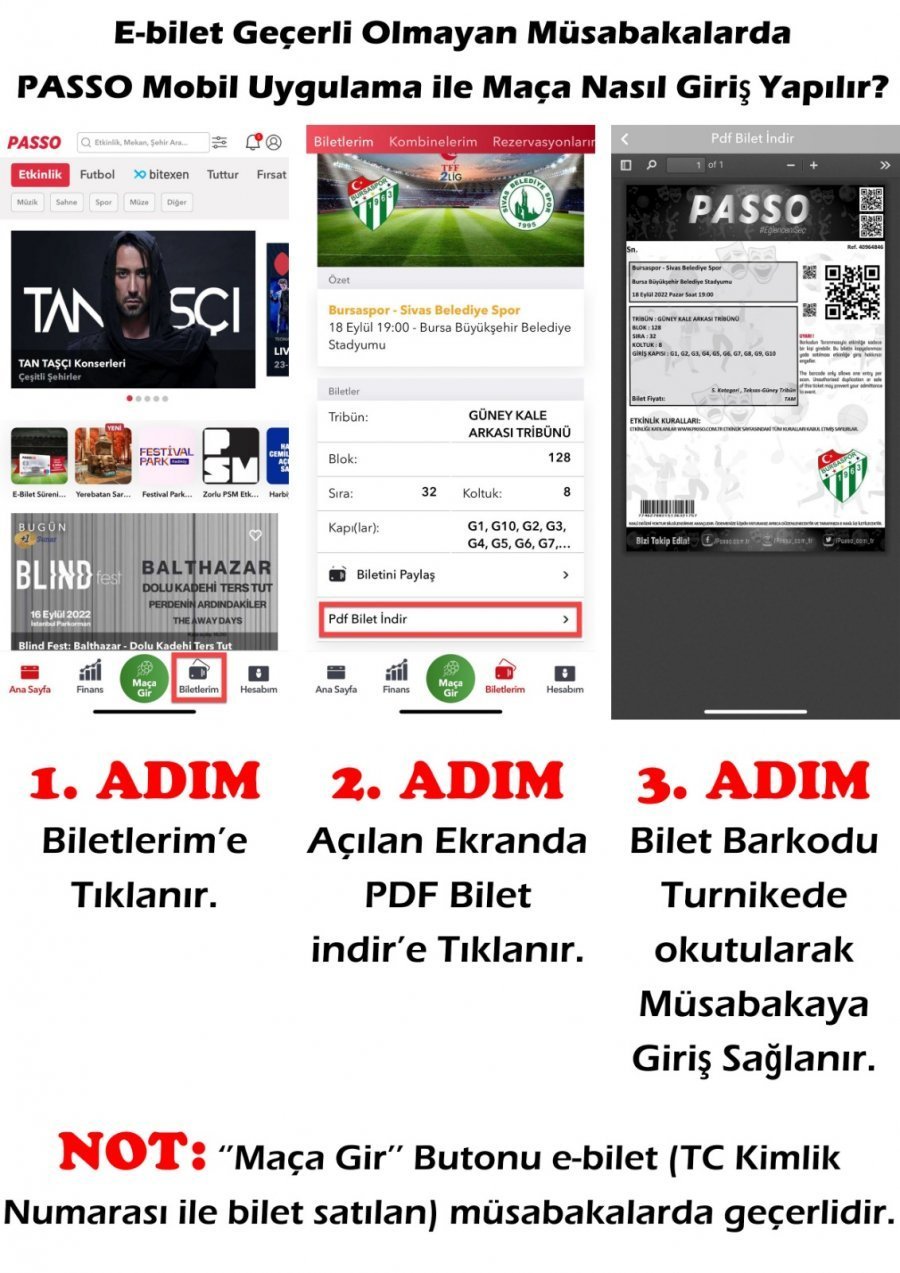 – Passo Mobil Uygulama ile müsabakaya biletlerim bölümündeki PDF bilet ile giriş yapılabilir, Passo Mobil Uygulamada ki “Maça Gir” butonu e-bilet müsabakaları için geçelidir, 2022-2023 futbol sezonu müsabakalarımızda aktif olmayacaktır.