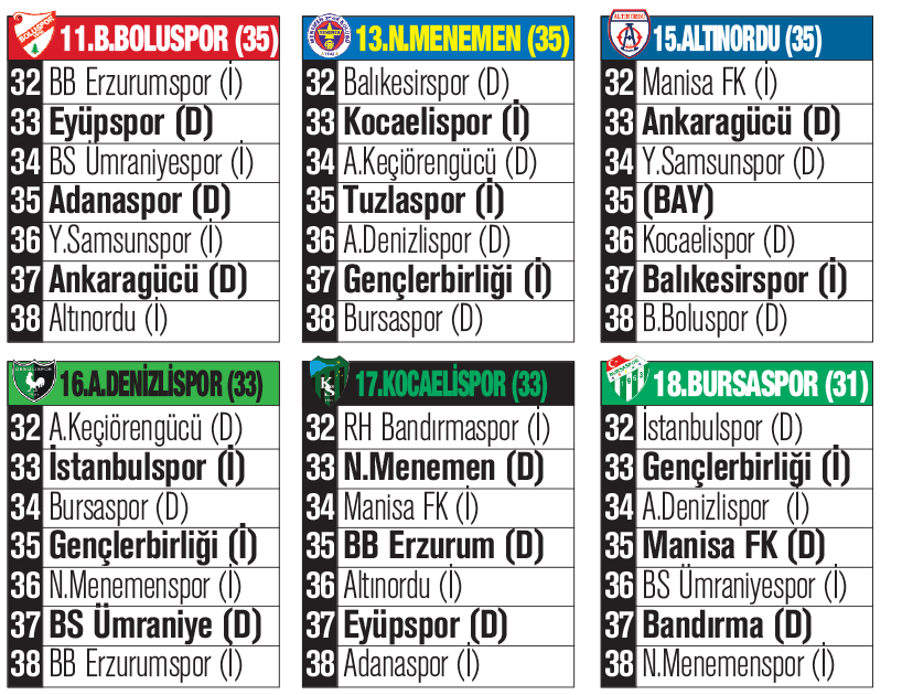 Düşme hattının hemen üzerindeki Altınordu’nun ise puanı 35. Menemenspor ve Boluspor’da 35’er puanla sıralanıyor. Haftayı galibiyetle kapatan takımlardan Gençlerbirliğ ve Tuzlaspor ise puanlarını 38’e yükseltip düşme hattıyla farkı 5 puana çıkararak soluklandı.