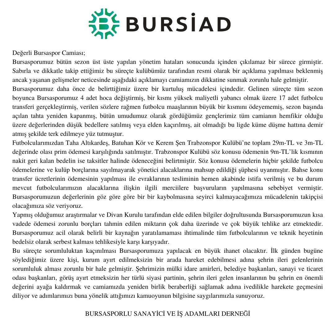 BURSİAD’tan yapılan açıklama şu şekilde: “Değerli Bursaspor Camiası; Bursasporumuz bütün sezon üst üste yapılan yönetim hataları sonucunda içinden çıkılamaz bir sürece girmiştir. Sabırla ve dikkatle takip ettiğimiz bu süreçte kulübümüz tarafından resmi olarak bir açıklama yapılması beklenmiş ancak yaşanan gelişmeler neticesinde aşağıdaki açıklamayı camiamızın dikkatine sunmak zorunlu hale gelmiştir. Bursasporumuz daha önce de belirttiğimiz üzere bir kurtuluş mücadelesi içindedir. Gelinen süreçte tüm sezon boyunca Bursasporumuz 4 adet hoca değiştirmiş, bir kısmı yüksek maliyetli yabancı olmak üzere 17 adet futbolcu transferi gerçekleştirmiş, verilen sözlere rağmen futbolcu maaşlarının büyük bir kısmını ödeyememiş, sezon başında açılan tahta yeniden kapanmış, bütün umudumuz olarak gördüğümüz gençlerimiz tüm camianın hemfikir olduğu üzere değerlerinden düşük bedellere satılmış veya elden kaçırılmış, ait olmadığı bu ligde küme düşme hattına demir atmış şekilde terk edilmeye yüz tutmuştur. Futbolcularımızdan Taha Altıkardeş, Batuhan Kör ve Kerem Şen Trabzonspor Kulübü’ne toplam 29m-TL ve 3m-TL değerinde prim ödemesi karşılığında satılmıştır. Trabzonspor Kulübü söz konusu ödemenin 9m-TL’lik kısmının nakit geri kalan bedelin ise taksitler halinde ödeneceğini belirtmiştir.