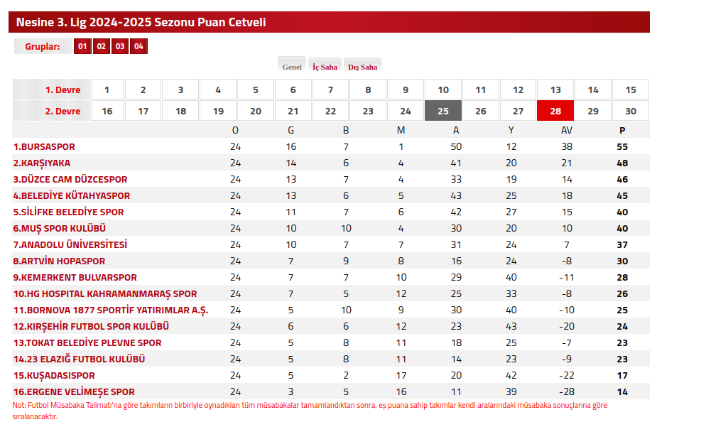Nesine 3.Lig 1. Grup puan durumu için tıklayın…