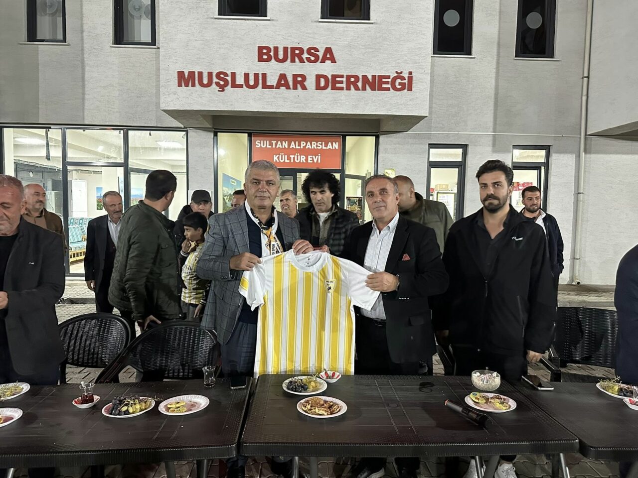 Bursa Muşlular Derneği, Muşspor Kulüp Başkanı Fatih Cengiz, yönetim kurulu üyeleri Erdal Alkaş ve Murat Bozyel ile birlikte Bursa Muşspor Taraftarlar Grubu’nu, dernek binasında ağırladı. Cumartesi günü oynanacak Bursaspor-Muşspor maçı öncesinde dostluk mesajları verilirken, Bursa Muşlular Derneği’nden yapılan açıklamada, “Bu güzel akşamda bizlerle olan Muşspor Kulübü yöneticilerine, taraftar grubuna, dernek yöneticilerimize ve tüm hemşehrilerimize teşekkür ediyoruz. Her birinin ayağına sağlık. Bir yanda doğduğumuz şehrin takımı Muşspor, diğer yanda doyduğumuz şehrin takımı Bursaspor. Bizim için bu maçın tek kazananı kardeşlik, centilmenlik ve dostluk olacaktır” ifadeleri yer aldı.