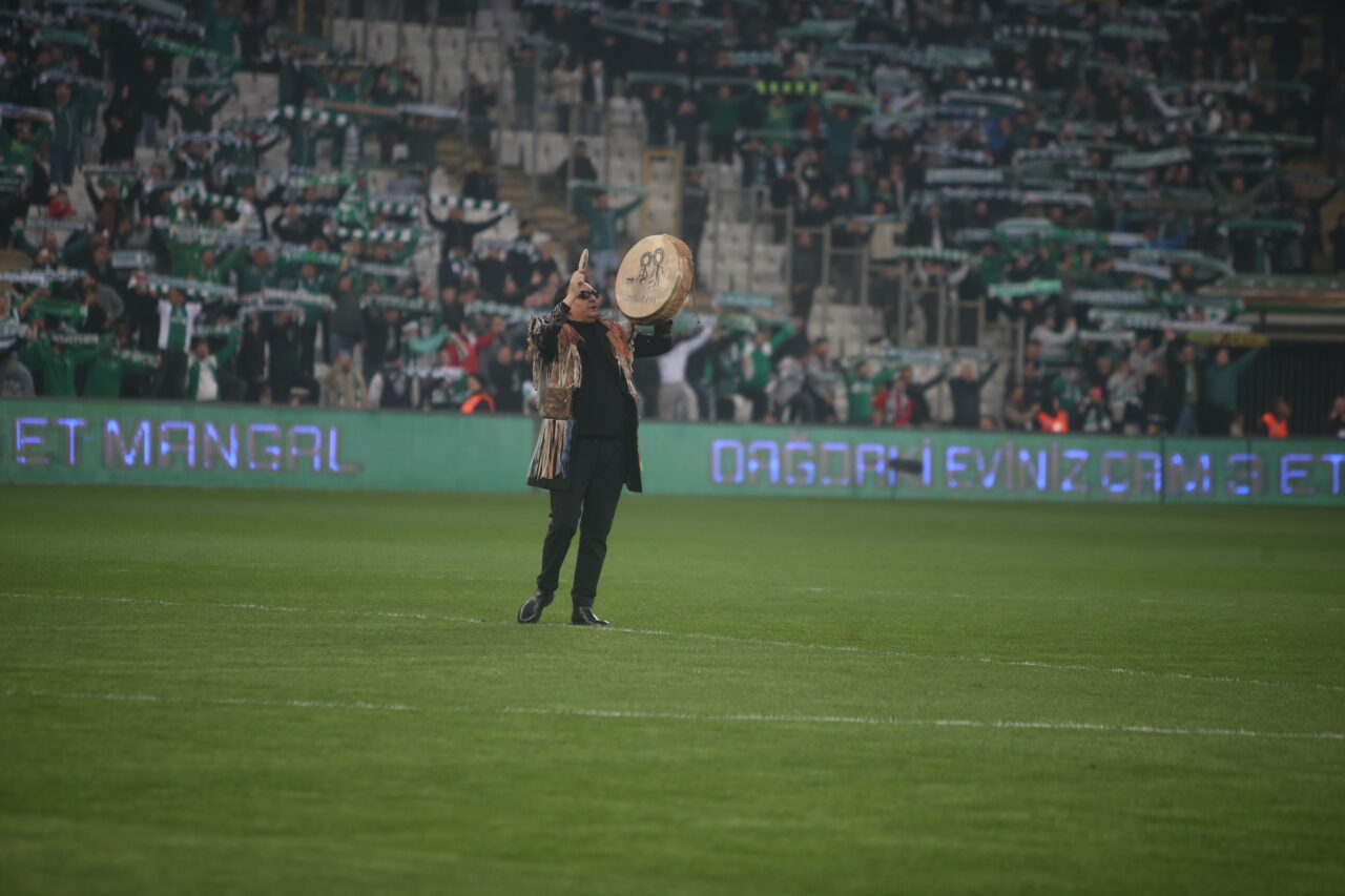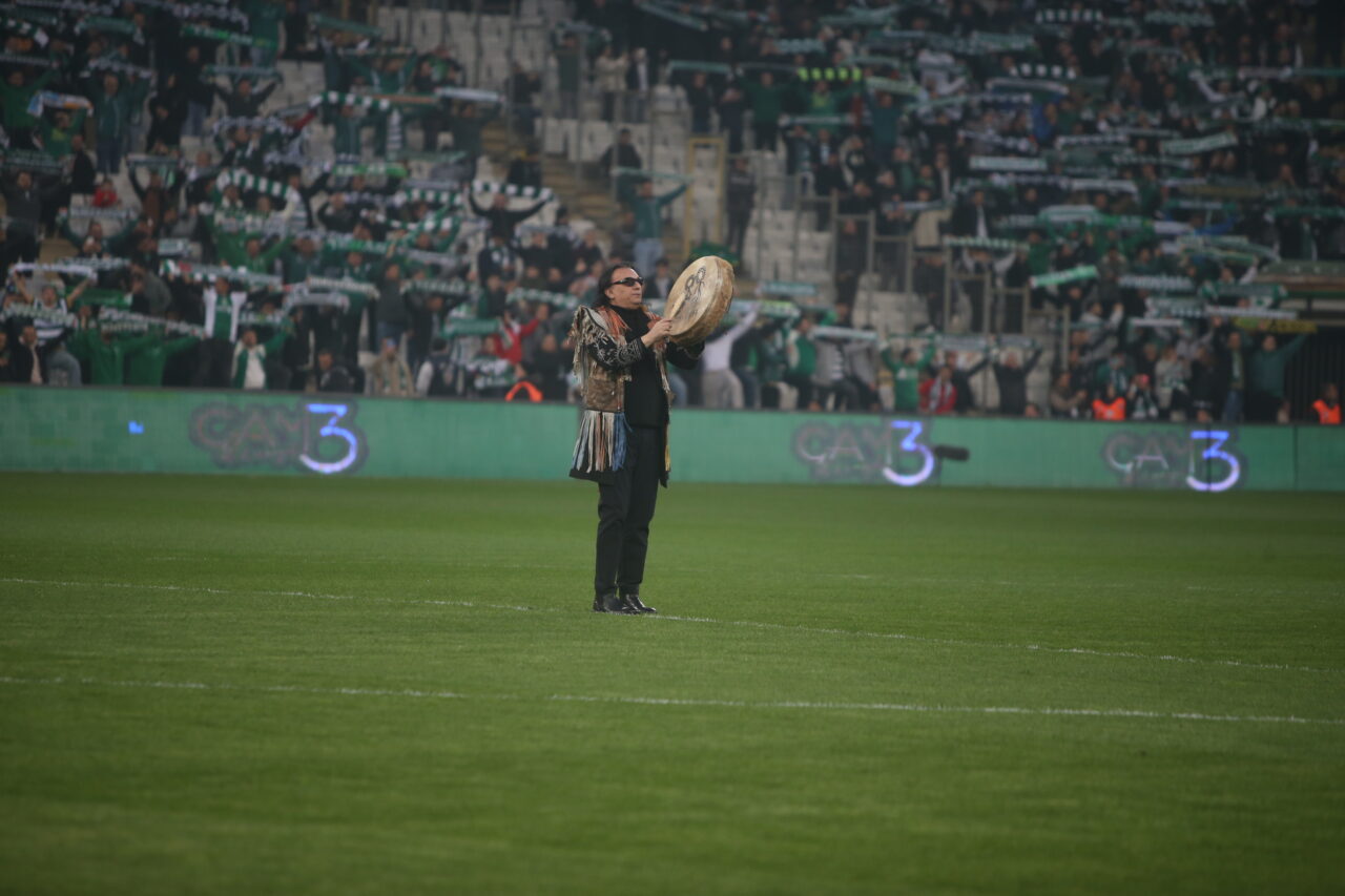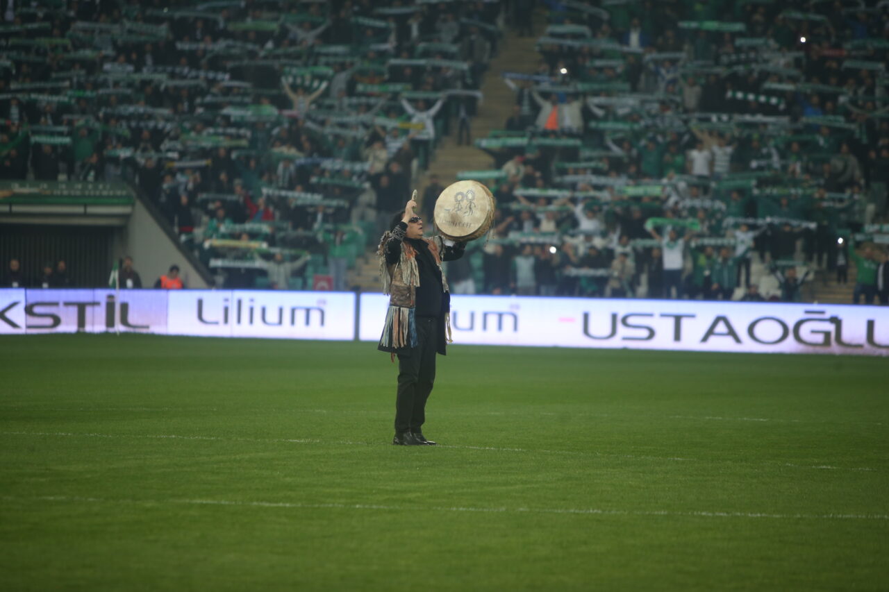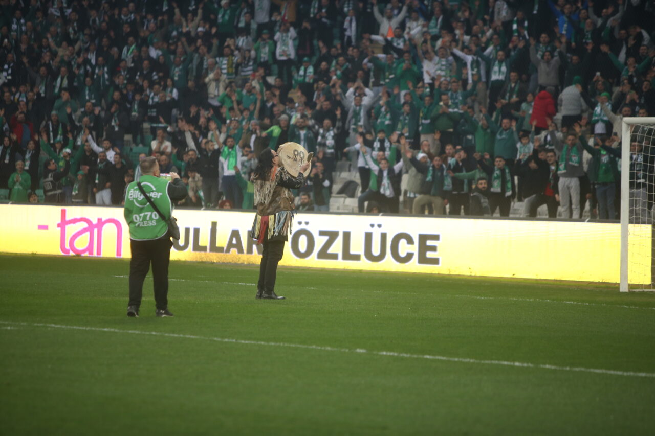 Efsane olan eserini Bursasporlu taraftarların huzurunda kam davuluyla bir kez daha çalan Kırdar’a, 42 bin civarında yeşil beyaz sevdası büyük ilgi gösterdi.