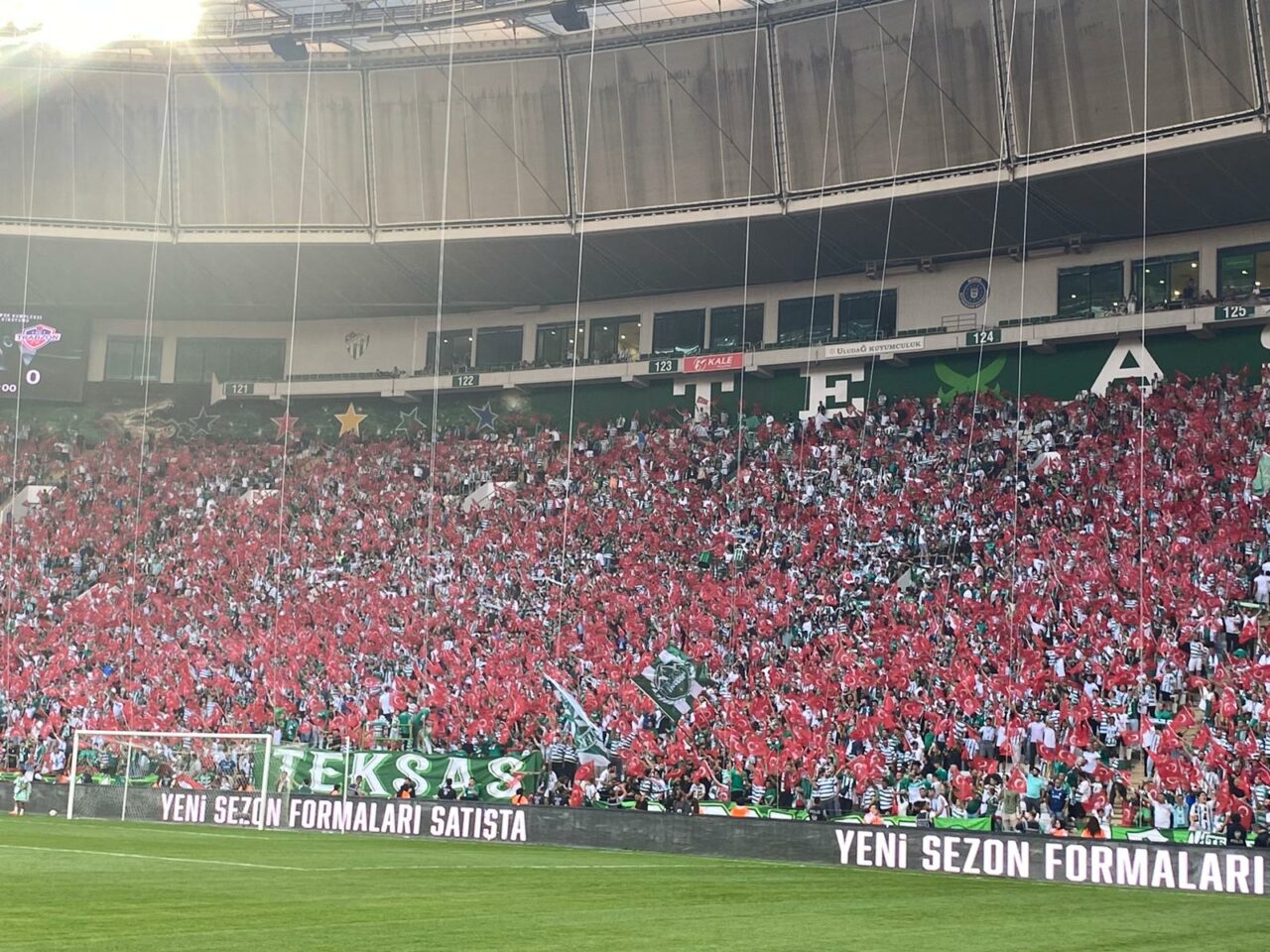 Bursaspor-1461 Trabzon FK maçında Atatürk Spor Kompleksi Matlı Stadyumu’nda yer alan koltuklara, 30 Ağustos Zafer Bayramı nedeniyle Türk bayrağı konuldu.