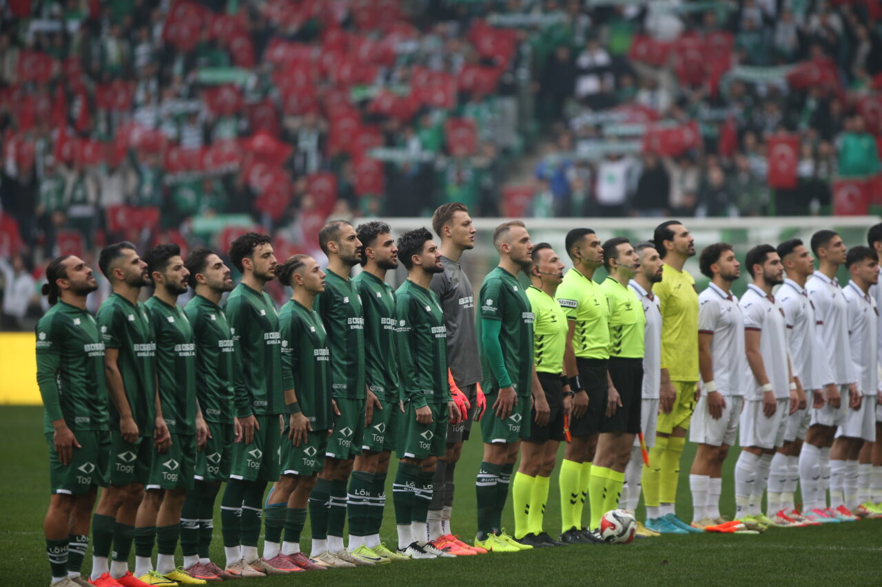 Bursaspor Teknik Direktörü Tahsin Tam, geçen haftaya göre ilk 11’de iki değişiklik yaptı. Orta sahada Tunahan Ergül’ün yerine Muhammet Zeki Dursun’a görev veren Tam, kolu kırılan Baran Başyiğit’in yerine ise İlhan Depe’yi 11’de oynattı. İlk 45 dakikada en ileri uçta Ertuğrul İdris Furat yer aldı.