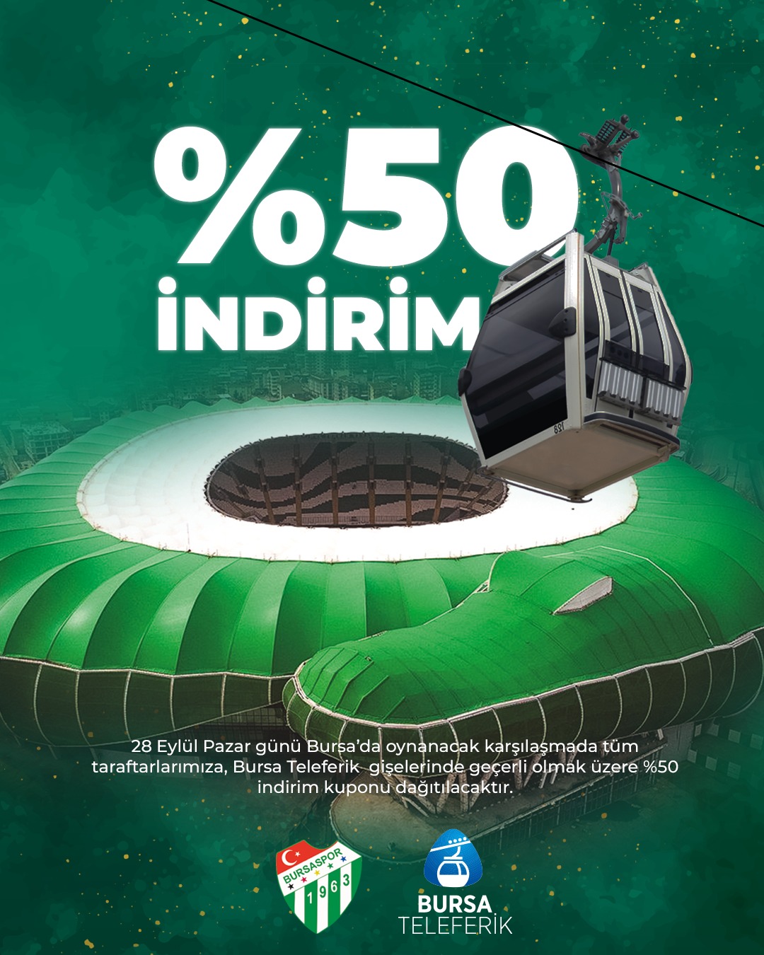 “28 Eylül Bursa’da oynanacak karşılaşmada taraftarlarımız için özel hediyelerimiz var! Bursa Teleferik gişelerinde geçerli %50 indirim kuponları, Timsah Arena Stadyumu’nda sizlerle buluşuyor!”