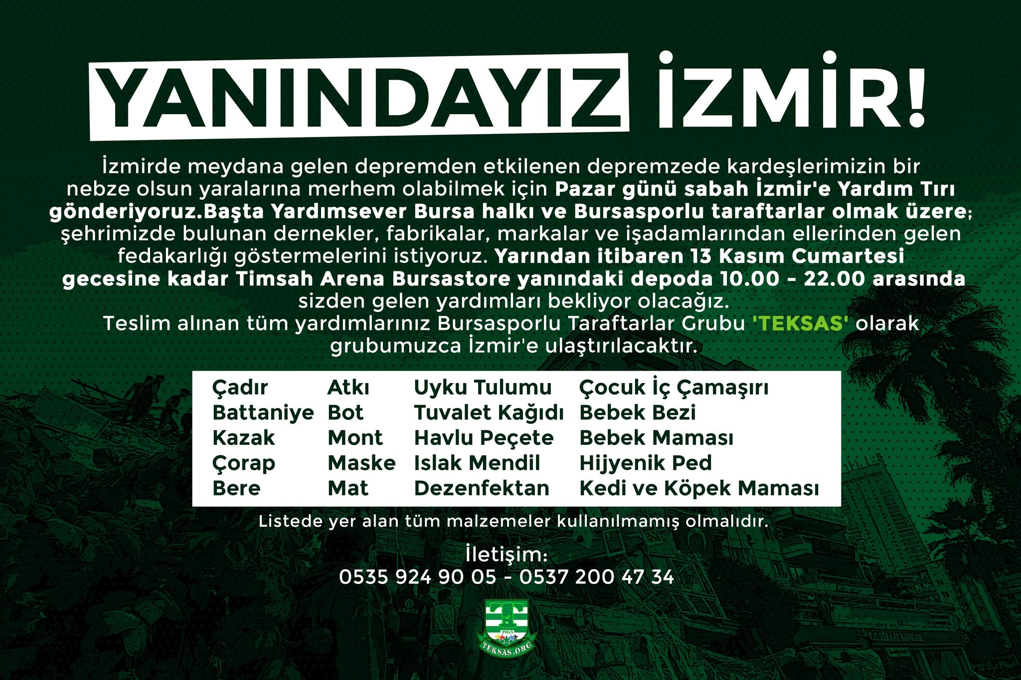 4-13 Kasım tarihlerinde Bursa Büyükşehir Belediye Stadyumu’ndaki Bursastore’un yanındaki depoda saat 10.00-22.00 saatleri arasında toplanacak yardımlar TIR ile İzmir’e gönderilecek. (İHA)